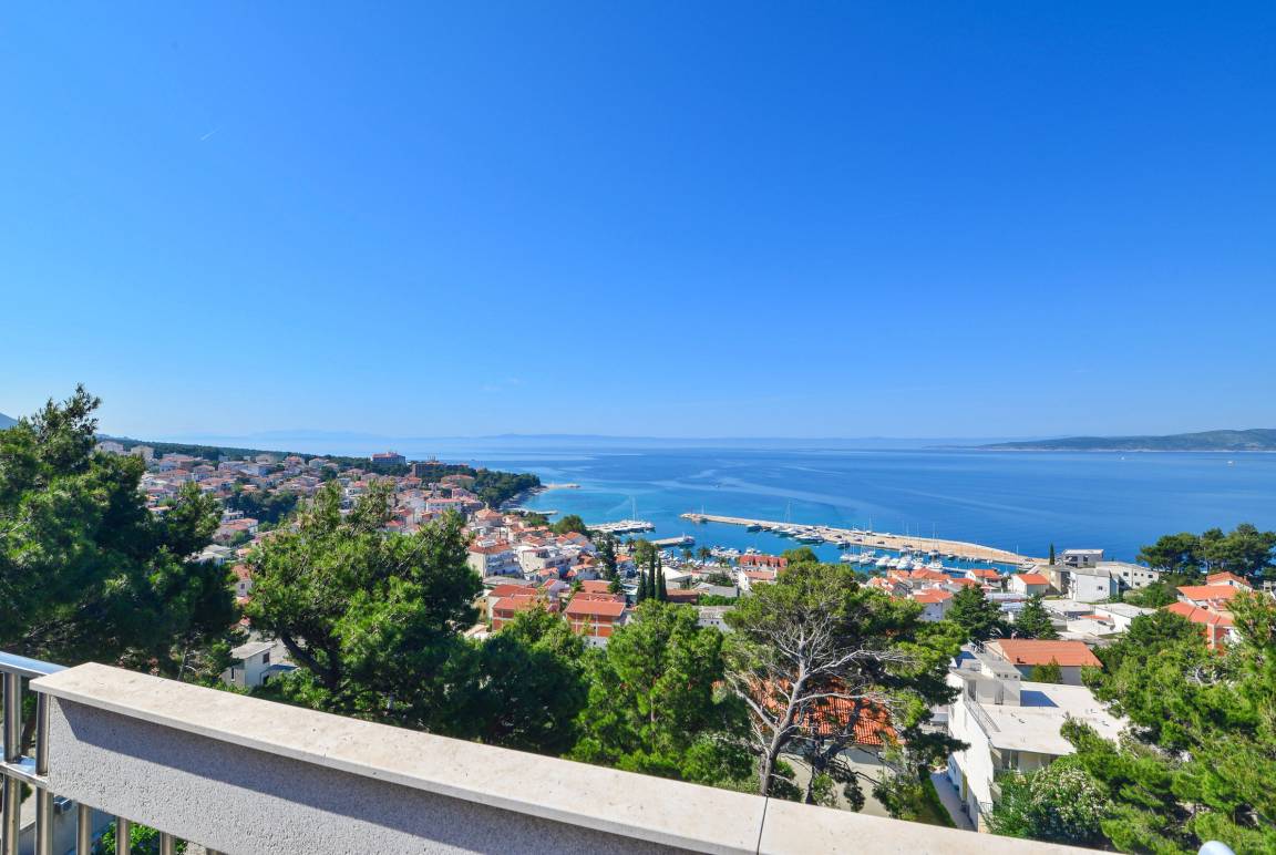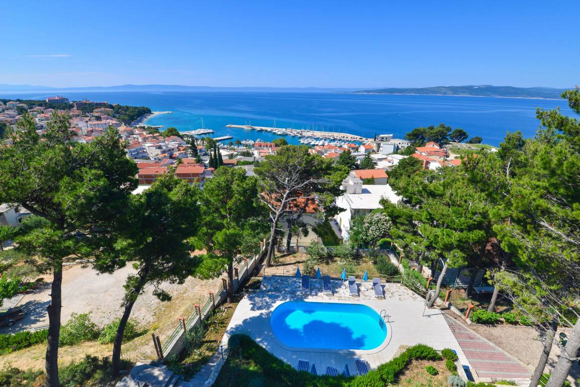 Meerblick zwischen Pinien - das komfortable Haus liegt direkt oberhalb des bekannten Badeortes Baska Voda. 3.000 qm Grundstück garantieren trotz Stadtnähe Ruhe und Erholung - sowie einen malerischen Blick auf die kroatische Adria.