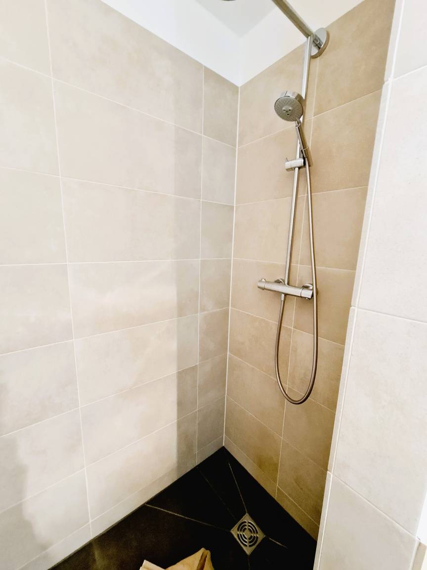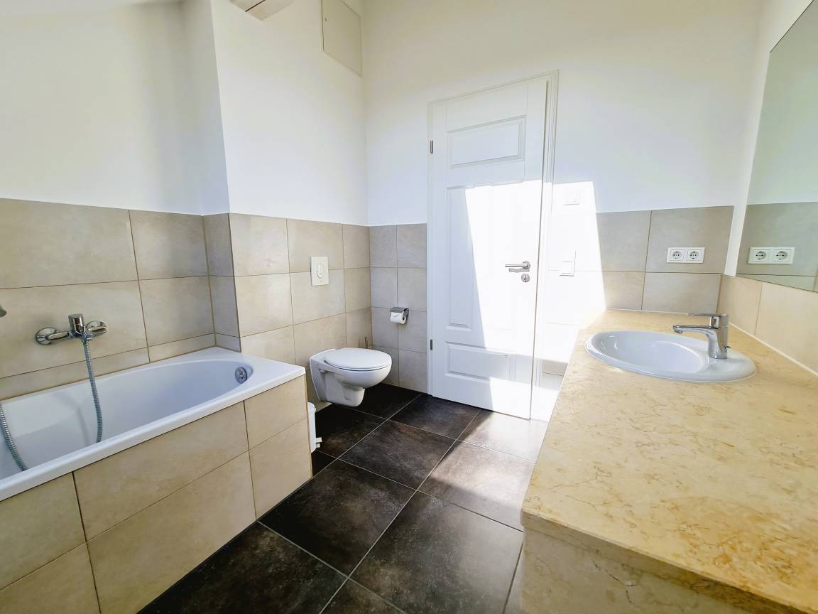 Auf 100 qm bietet diese exklusive Wohnung zwei Schlafzimmer, an die sich je eigene Bäder – Duschbad & Vollbad – anschließen. Die beiden Bereiche sind durch das offene, großzügige Wohnzimmer voneinander getrennt, sodass die Wohnung bestens geeignet ist für befreundete Paare und Familien mit Kindern. Selbstverständlich erwartet Sie hier eine komplett ausgestattete, separate Küche.