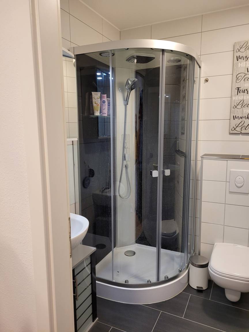 Das innenliegende BADEZIMMER verfügt über Dusche, WC, Wachbecken und Spiegel.