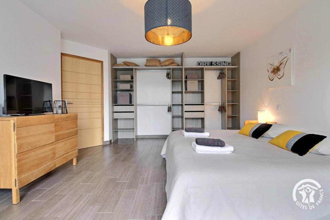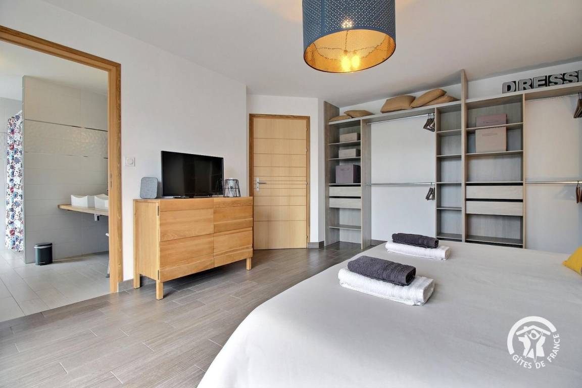 - Ein Schlafzimmer mit einem 180x200 cm großen Bett und eigenem Badezimmer mit WC (PMR-zugelassen)