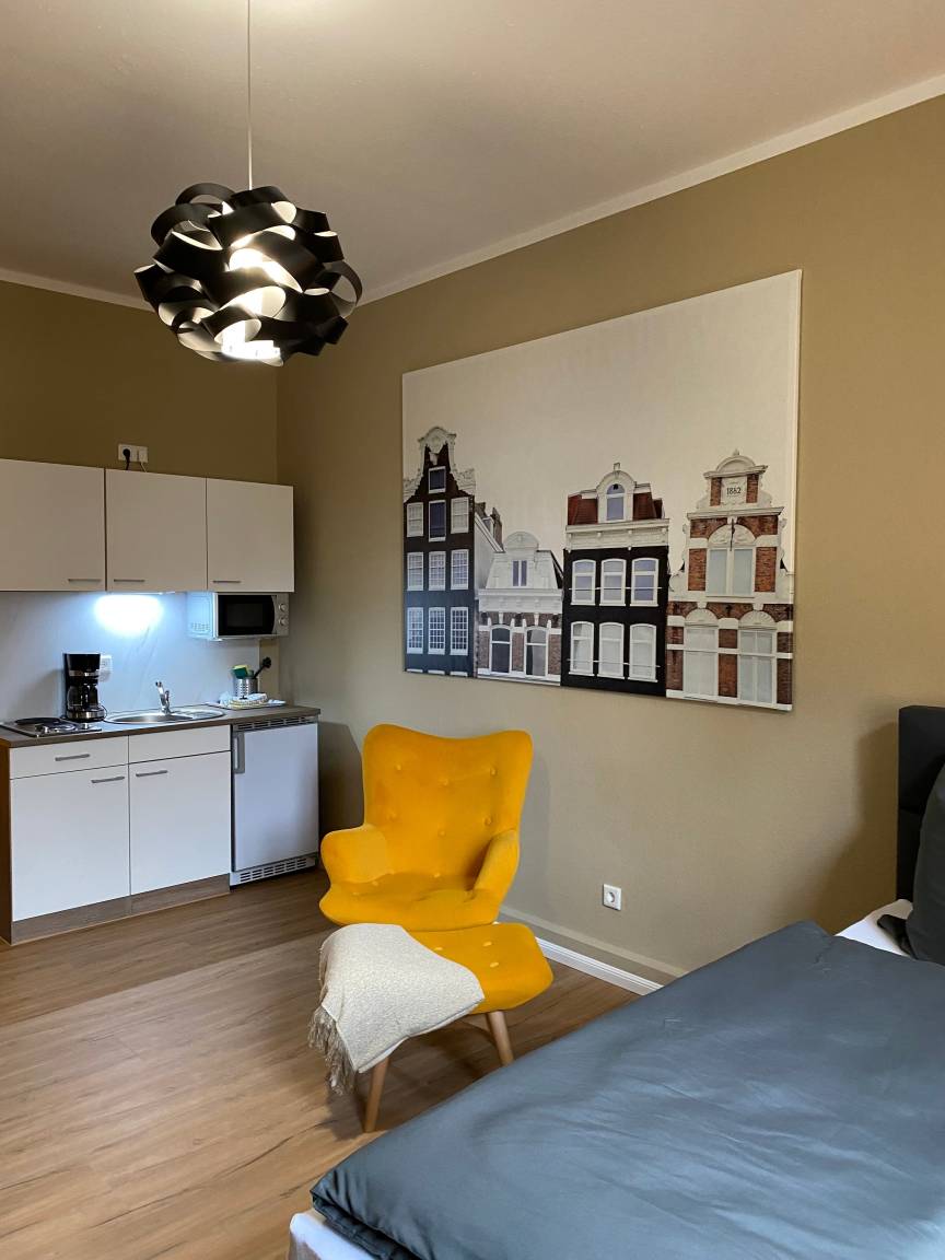 Unsere schöne Ferienwohnung "zur Post 3" begrüßt Sie auf ca. 22 m² mit einem freundlichen Ambiente für bis zu zwei Personen. Die stilvoll und modern eingerichtete Ferienwohnung bietet Ihnen eine Küchenzeile, einen kleinen Essbereich sowie ein Queen-Size-Bett (140x200). Weiterhin erwartet Sie ein Badezimmer mit einer Dusche.