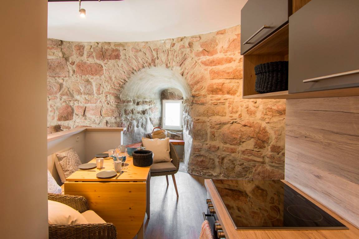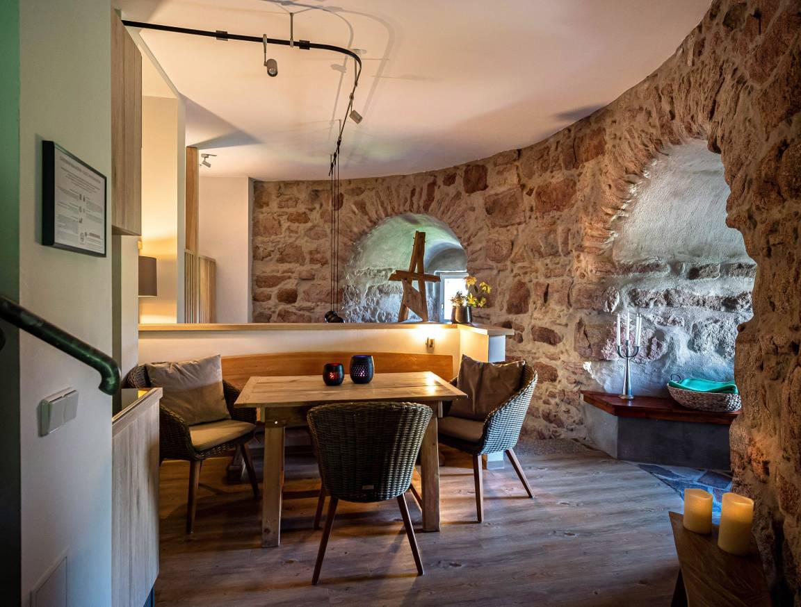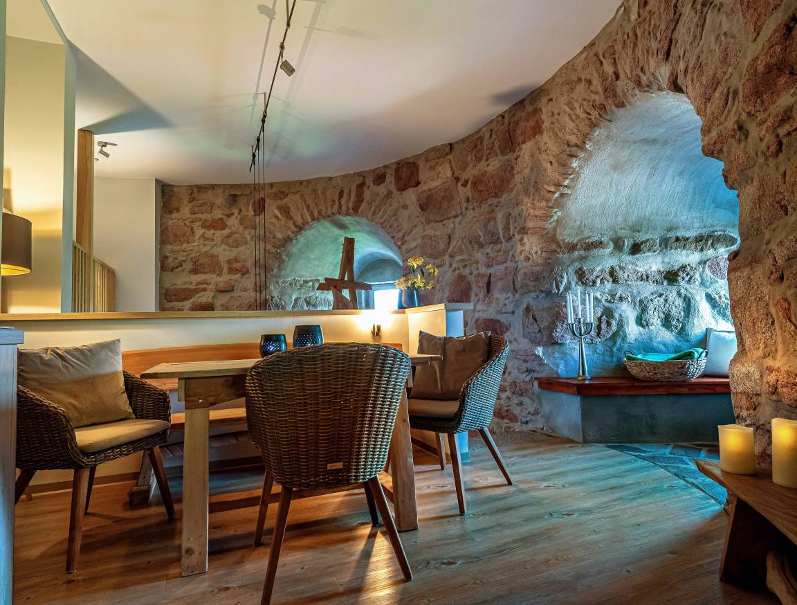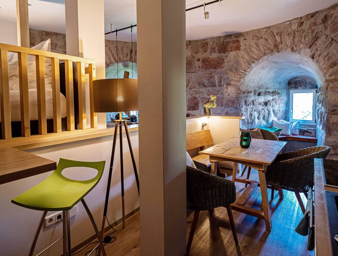 Die Suite besteht aus einer offenen zweietagigen Galerie, einem eigenen Wellnessbereich mit finnischer Sauna und freistehender Wanne, umrandet von 500 Jahre altem und liebevoll restaurierten Natursteinmauerwerk, welches dem Rundbau einen eigenen Charme verleiht. Im Oberrang der Galerie befindet sich eine vollausgestattete moderne Küche mit einem gemütlichen Frühstücksbereich sowie einem einladenenden Hochbett auf einer freistehenden hölzernen Plattform mit Blick in den durch eine Glastür abgetrenten Wellnessbereich. Unterhalb des Hochbetts, im unteren Teil der Galerie befindet sich eine gemütliche Kuschelecke, welche auch als Schlafgelegenheit für weitere Gäste geeignet ist.
