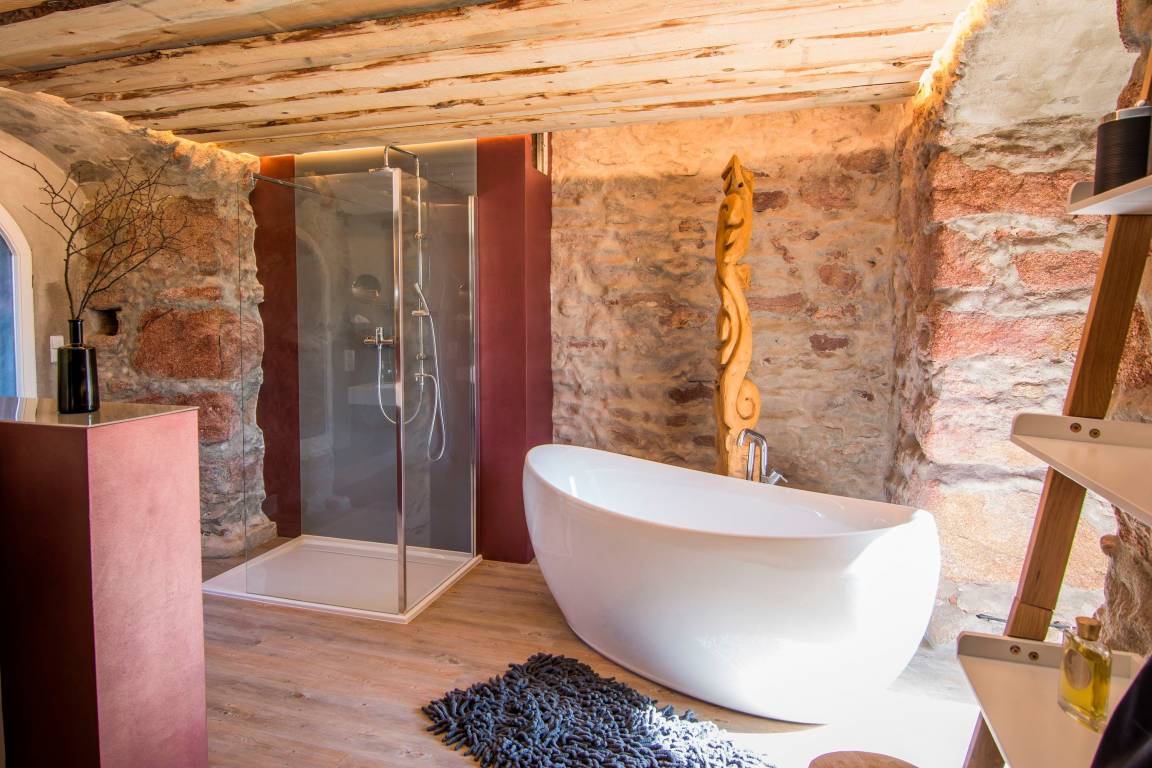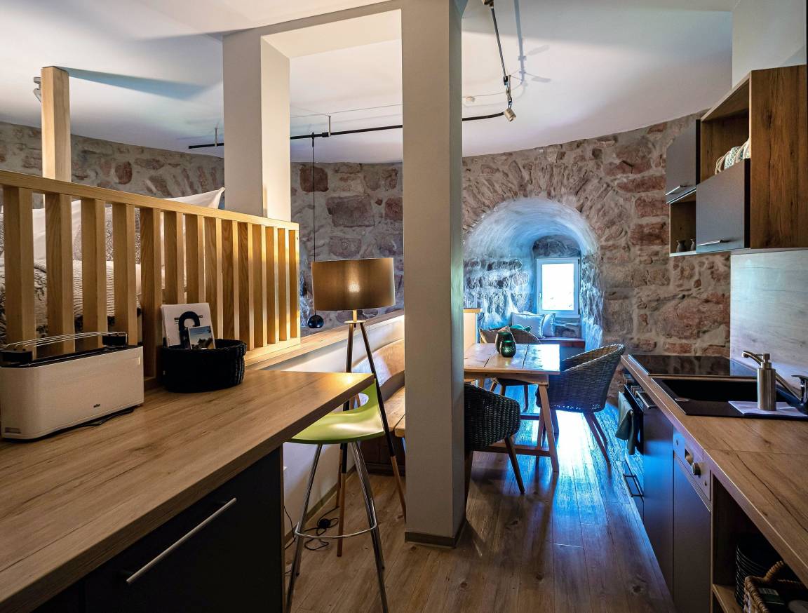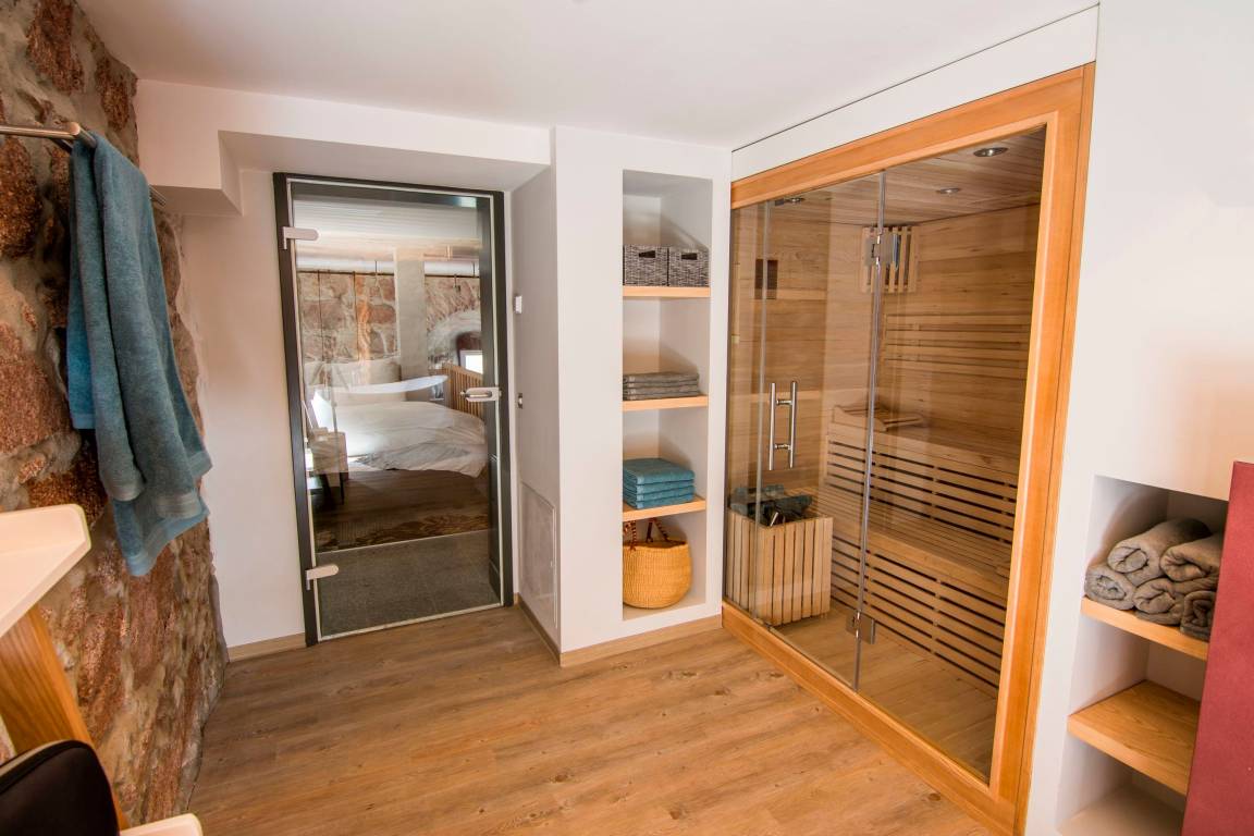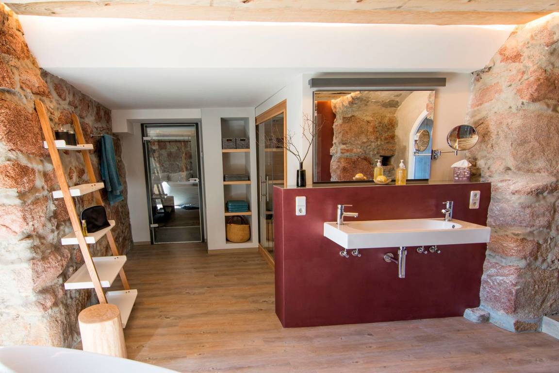 Die Suite besteht aus einer offenen zweietagigen Galerie, einem eigenen Wellnessbereich mit finnischer Sauna und freistehender Wanne, umrandet von 500 Jahre altem und liebevoll restaurierten Natursteinmauerwerk, welches dem Rundbau einen eigenen Charme verleiht. Im Oberrang der Galerie befindet sich eine vollausgestattete moderne Küche mit einem gemütlichen Frühstücksbereich sowie einem einladenenden Hochbett auf einer freistehenden hölzernen Plattform mit Blick in den durch eine Glastür abgetrenten Wellnessbereich. Unterhalb des Hochbetts, im unteren Teil der Galerie befindet sich eine gemütliche Kuschelecke, welche auch als Schlafgelegenheit für weitere Gäste geeignet ist.
