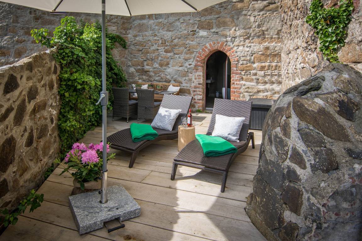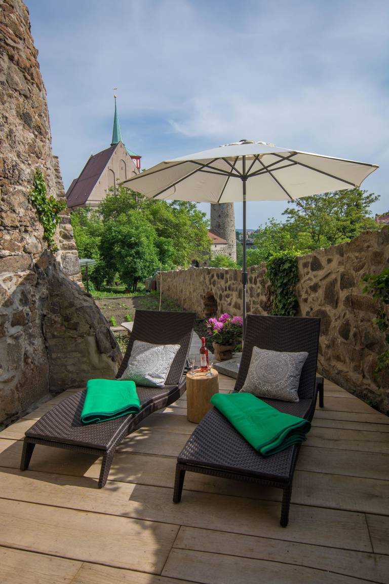 Die Suite besitzt insgesamt zwei eigene Aussenbereiche, einer modernen Terasse mit Blick auf die historische Umgebung, sowie einem Aussenbereich direkt am Reymanweg der Stadtmauer Bautzens.