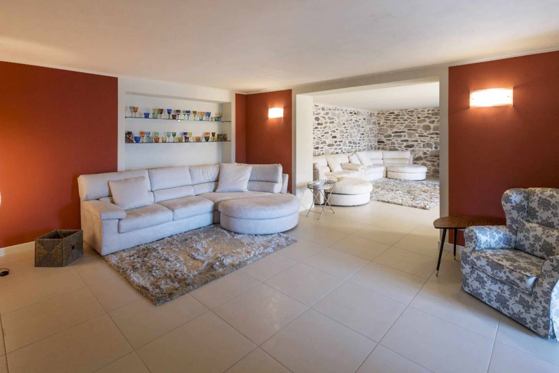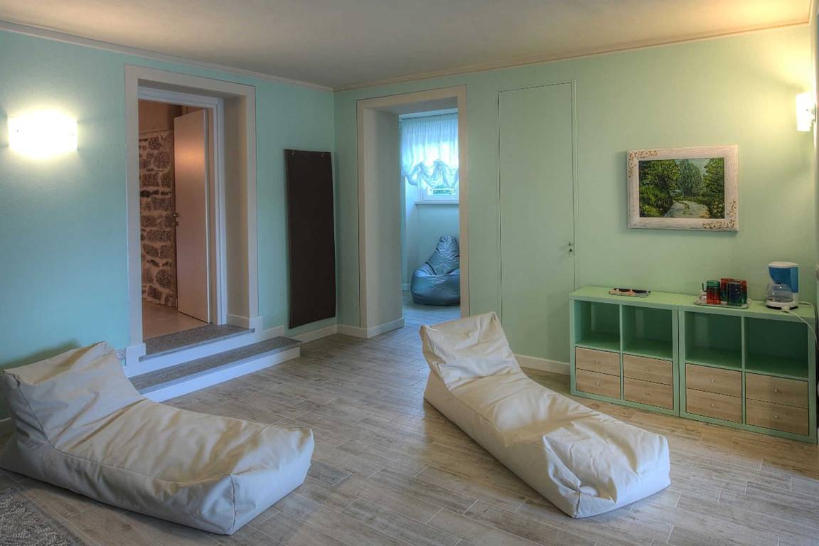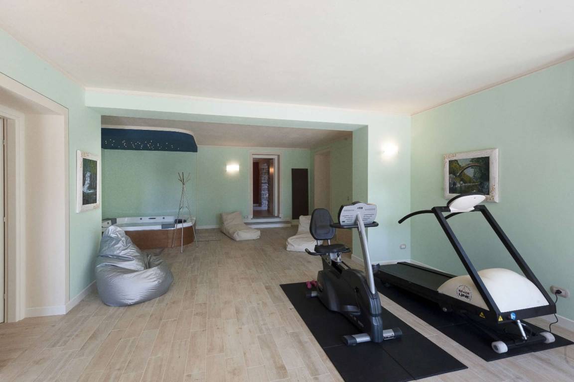 Das Untergeschoss beherbergt einen vollständig klimatisierten Wellness- und Entspannungsbereich, der über Glastüren direkt vom Garten oder vom Wohnbereich der Villa zugänglich ist. Dieser Bereich verfügt über eine Whirlpool-Badewanne für 5 Personen, ein gut ausgestattetes Fitnessstudio und eine Entspannungs- und Teeecke mit Betten; ein vollständiges Bad mit Dusche ergänzt den Wellnessbereich. Ein Multifunktionsraum mit Natursteinwänden ist mit einem Fernseher, einem Spielzimmer mit Kinderspielzeug, Tischtennis, Tischfußball, mehreren Sofas und Sesseln sowie einem beeindruckenden Refektoriumstisch ausgestattet und bietet einen schönen Seeblick. Ein separater Wäscheraum im Untergeschoss ist mit einer Waschmaschine, einem Trockner und einem Bügeleisen ausgestattet.