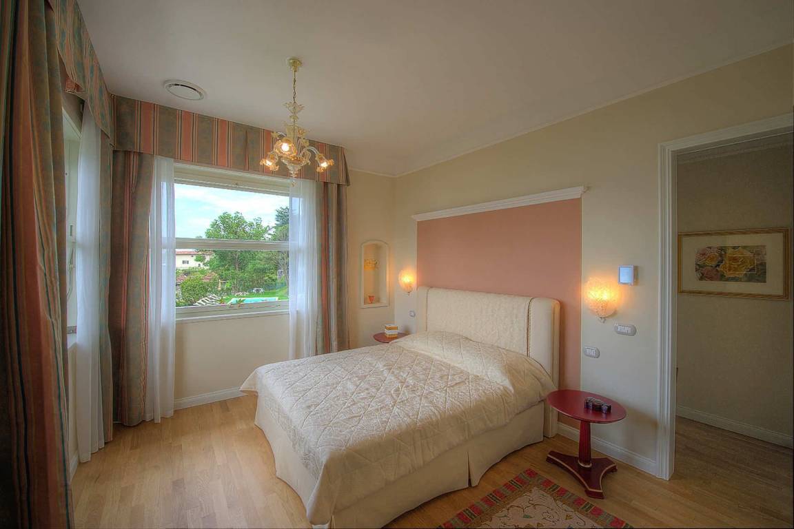 Das erste Obergeschoss beherbergt alle 5 Schlafzimmer mit Doppelbetten, jeweils mit Klimaanlage, Minibar und Flachbildfernseher mit Satellitenempfang. Das erste Schlafzimmer mit Seeblick ist mit einem Kingsize-Bett und einem en-suite Bad mit Dusche ausgestattet. Das zweite Schlafzimmer mit Seeblick verfügt über einen privaten Balkon und ein en-suite Bad mit Dusche. Das dritte Schlafzimmer mit Seeblick ist mit zwei zusammenstellbaren Einzelbetten und einem en-suite Bad mit Dusche ausgestattet. Das vierte Schlafzimmer mit Gartenblick verfügt über zwei zusammenstellbare Einzelbetten und ein en-suite Bad mit Dusche. Das fünfte Schlafzimmer mit Seeblick ist mit zwei Einzelbetten und einem zusätzlichen Einzelschlafsofa ausgestattet und verfügt über ein en-suite Bad mit Dusche.