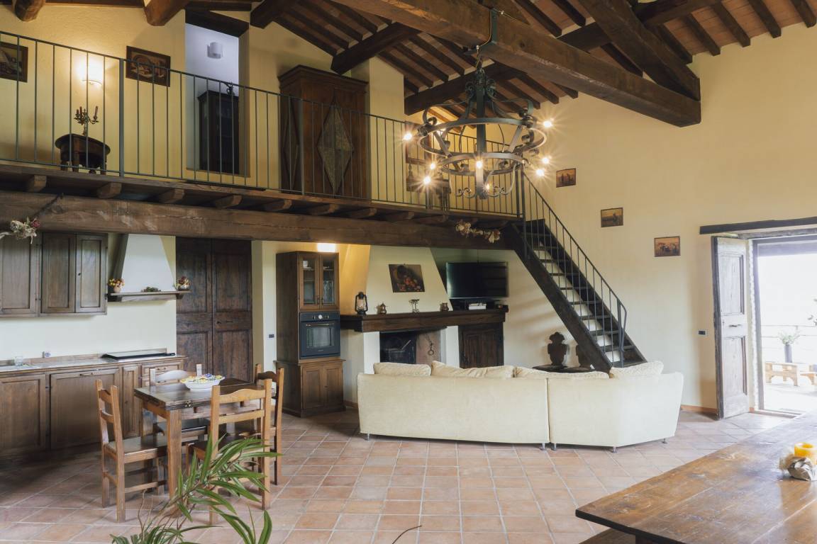 Wohnküche: zwei Esstische (Personen: 12), Spülmaschine, Kühlschrank, Tiefkühler, Mikrowelle, Herd, Ofen, Toaster, Italienische Kaffeemaschine, Sofa, Kamin, WiFi Internet, TV.