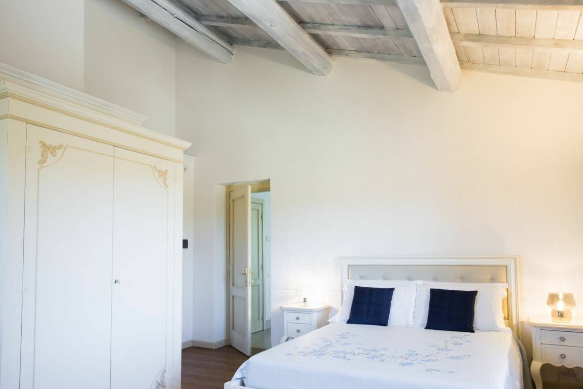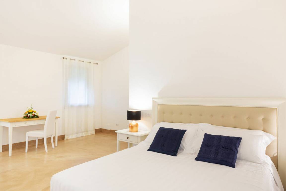 Schlafzimmer mit Bad 1: Doppelbett, WiFi Internet, Klimaanlage, Whirlpool-Badewanne, Waschbecken, WC, Bidet, Dusche.