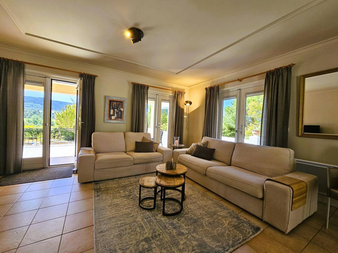 Das Wohnzimmer, das zur Terrasse hin offen ist, bietet einen schönen Blick auf die Hügel und gibt direkt einen Blick auf den großen Pool frei.