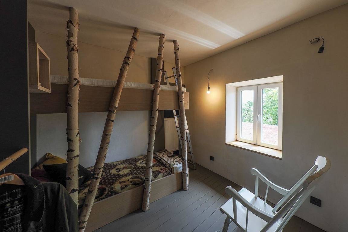 Das Familienzimmer ist mit seinem Doppelbett und den Etagenbetten optimal für Familien oder eine Gruppe von Freunden geeignet. Der Raum strahlt durch die Verwendung bzw. Zusammenstellung schlichter Materialien eine ruhige Atmosphäre aus.
