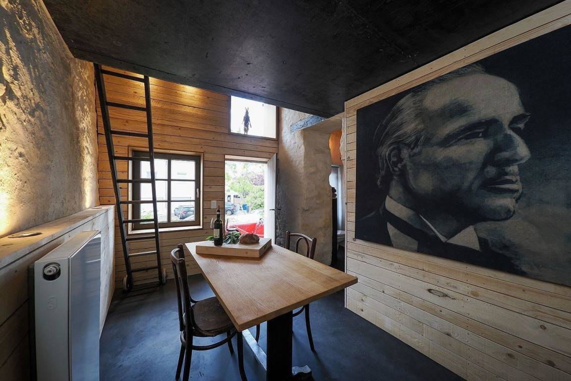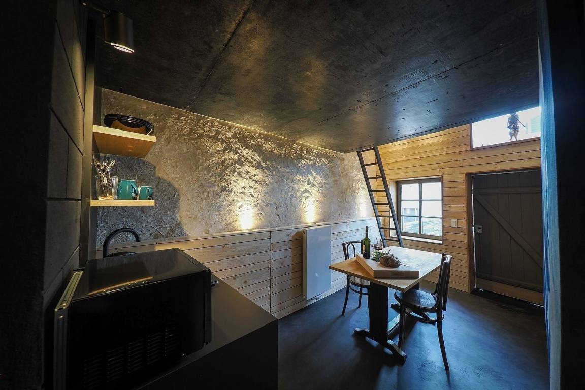 Die für diesen atypischen Raum verwendeten Materialien sind roher Beton, Massivholz und traditionelle Kalkfarbe. Diese Komposition hat ein rustikales und sauberes Design, das ein "männliches und maskulines" Gefühl vermittelt.