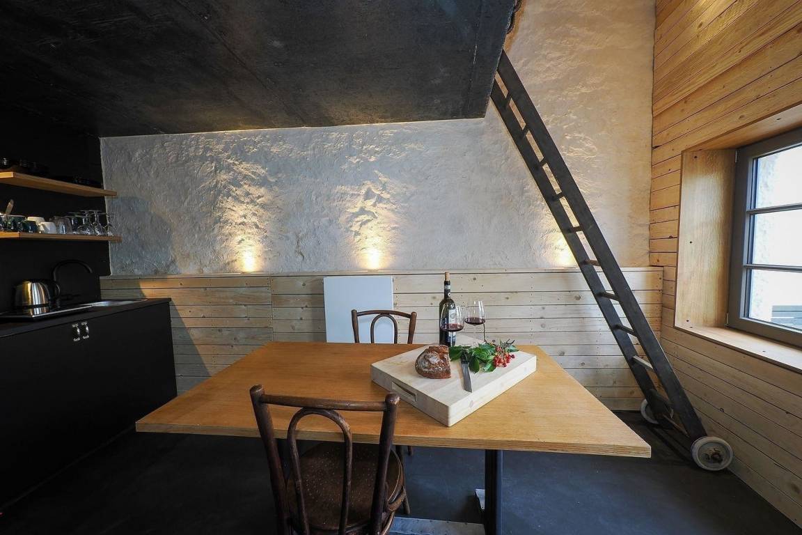 Der Raum 'Op der Gänn' bezieht sich auf die oberen Räume der regionalen Scheunen. Die eklektische Einrichtung entspricht nicht einem traditionellen Hotel: