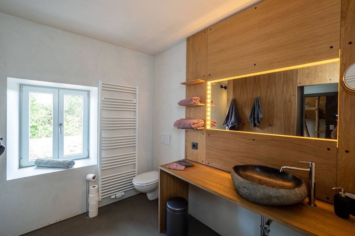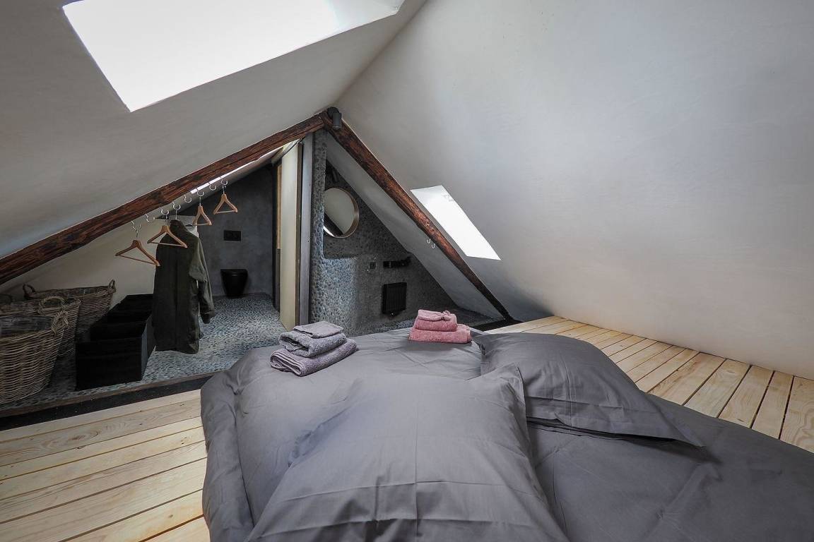 Das private Bad ist in diese minimalistische Komposition integriert. Die beiden Zimmer, die nebeneinander liegen, ermöglichen es allen, "zusammen zu sein" und gleichzeitig ein Gefühl von Privatsphäre zu haben.