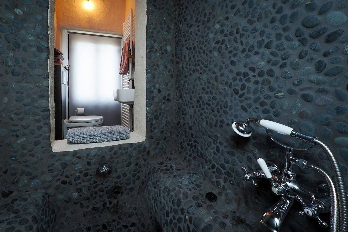 Nach dem privaten Eingang entdecken Sie im Erdgeschoss den Wohnbereich mit Kochnische und der angrenzenden ... sagen wir mal 'Badhöhle'.