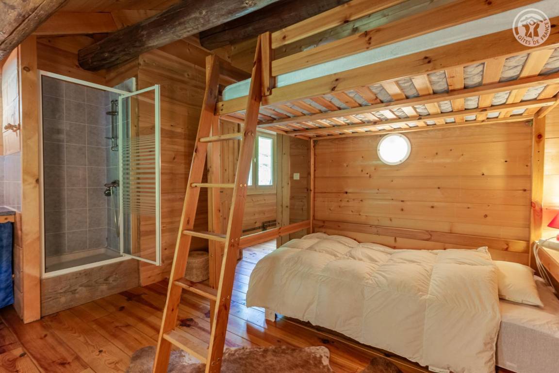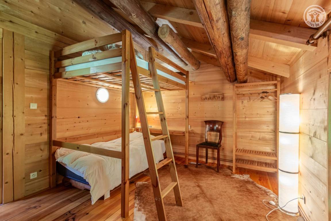 Die Ferienwohnung erstreckt sich über drei Ebenen und besteht im Erdgeschoss (Zugang über eine überdachte Außentreppe vom Carport, der von den beiden Ferienwohnungen gemeinsam genutzt wird): Küche, Schlafzimmer (1 Doppelbett 140x190 cm), Badezimmer (Dusche und WC). Obergeschoss: 2 Schlafzimmer (1 Einzelbett 90x190 cm, 1 Etagenbett mit niedriger Deckenhöhe / 1 Einzelbett 90x190 cm, 1 Doppelbett 140x190 cm) mit eigener Dusche/Waschbecken, Wohnzimmer (Fernseher) mit integriertem Zwischengeschoss im Dachgeschoss (Zugang über eine Leiter - 1 Doppelbett 140x190 cm). Gesamtfläche: 110 m² einschließlich Dachboden.