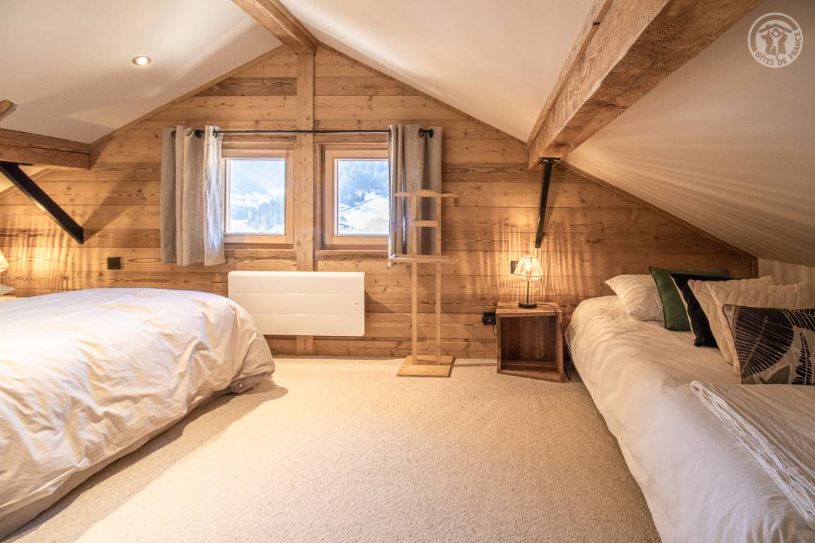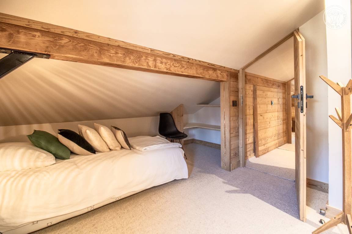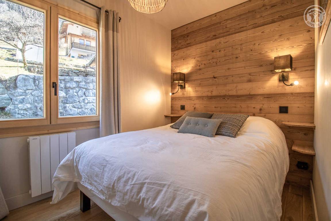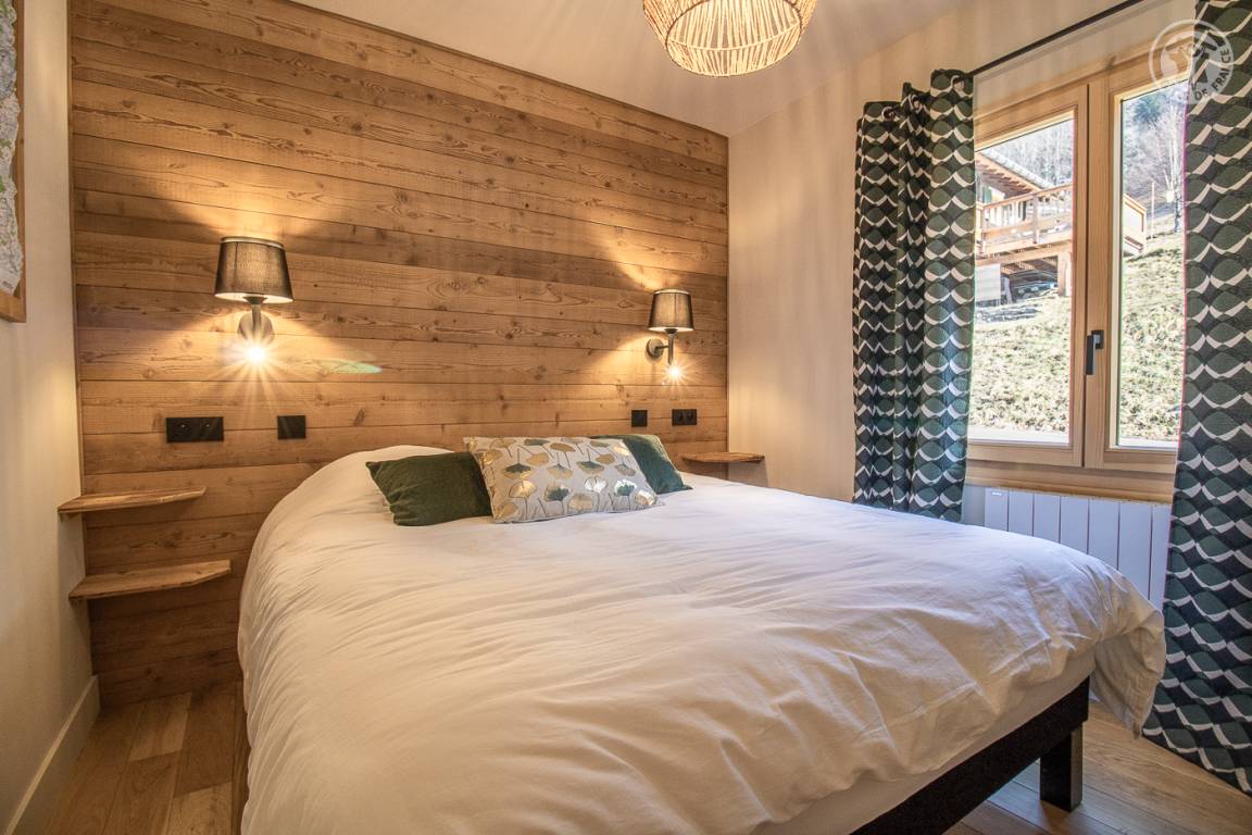Unabhängiges Chalet. Im Erdgeschoss: Wohnküche mit Zugang zu einer Balkonterrasse, separates WC, Waschküche, 2 Schlafzimmer (1 Doppelbett 140x190 cm / 1 Doppelbett 160x190 cm), Badezimmer (Dusche italienisch). Im 1. Stock: 2 Schlafzimmer (1 Doppelbett 140x190 cm / 1 Doppelbett 140x190 cm), Badezimmer (Dusche) mit WC. Privater Parkplatz.