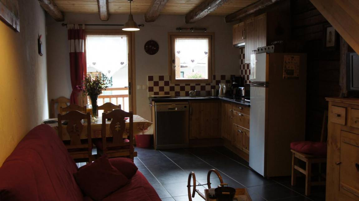 Haus, das an das Haus des Eigentümers grenzt. Ferienhaus auf 2 Ebenen. 1. Ebene (fast ebenerdiger Zugang über 3 Stufen): Wohnzimmer-Küche-Wohnbereich (1 Einzel-Schlafsofa), 1 Schlafzimmer (2 Einzel-Etagenbetten) mit komplett eigenem Bad (Dusche). Obergeschoss: 1 Schlafzimmer (1 Doppelbett), Badezimmer (Dusche). Kabellos. Balkon. Skigebiet Arêches 300 m, Les Saisies 25 km, Hauteluce-Val-Joly-Contamines-Monjoie 21 km, Schwimmbad 5 km.