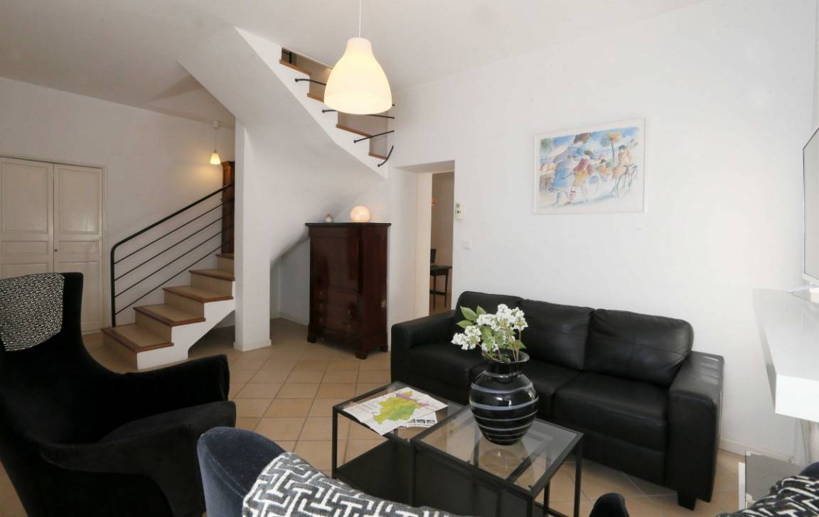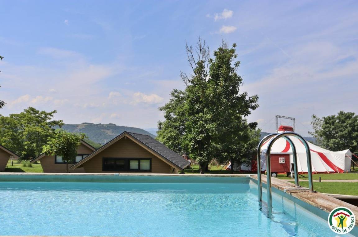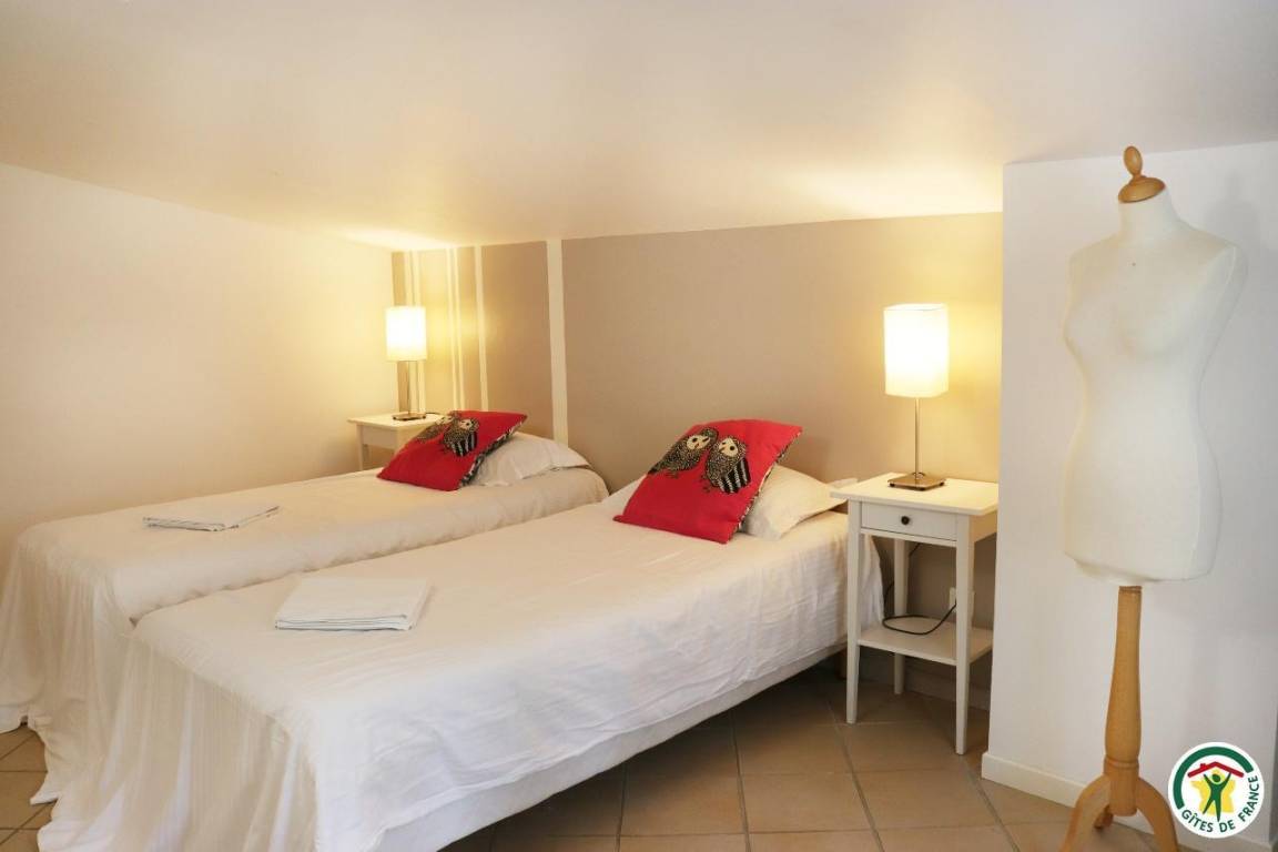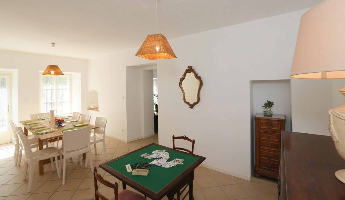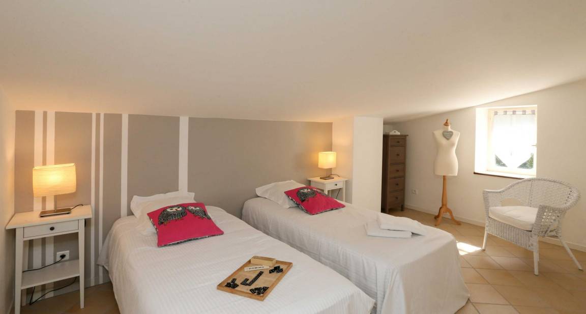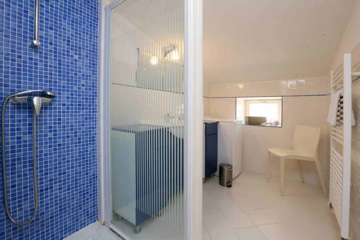 Erdgeschoss: Küche, Wohnzimmer, Esszimmer, Bad mit Dusche/WC. Obergeschoss: 3 Schlafzimmer, eines davon mit eigenem Badezimmer und WC (2 Betten 90 cm) (2 Betten 90 cm oder 1 Bett 180 cm) (2 Betten 90 cm oder 1 Bett 180 cm), Wohnzimmer mit Schlafsofa (1 Bett 160 cm), Bad (Dusche), separates WC. Schwimmbecken in gemeinsamer Nutzung mit den anderen Ferienunterkünften (feste Nutzungszeiten).