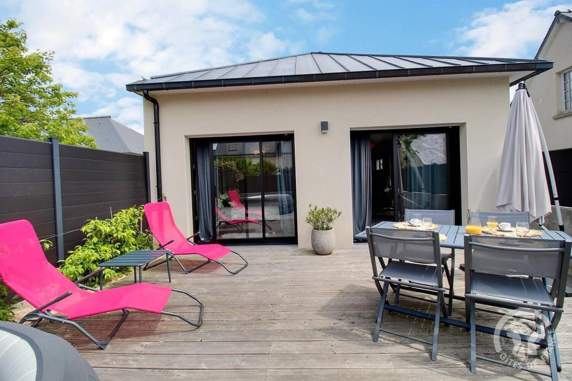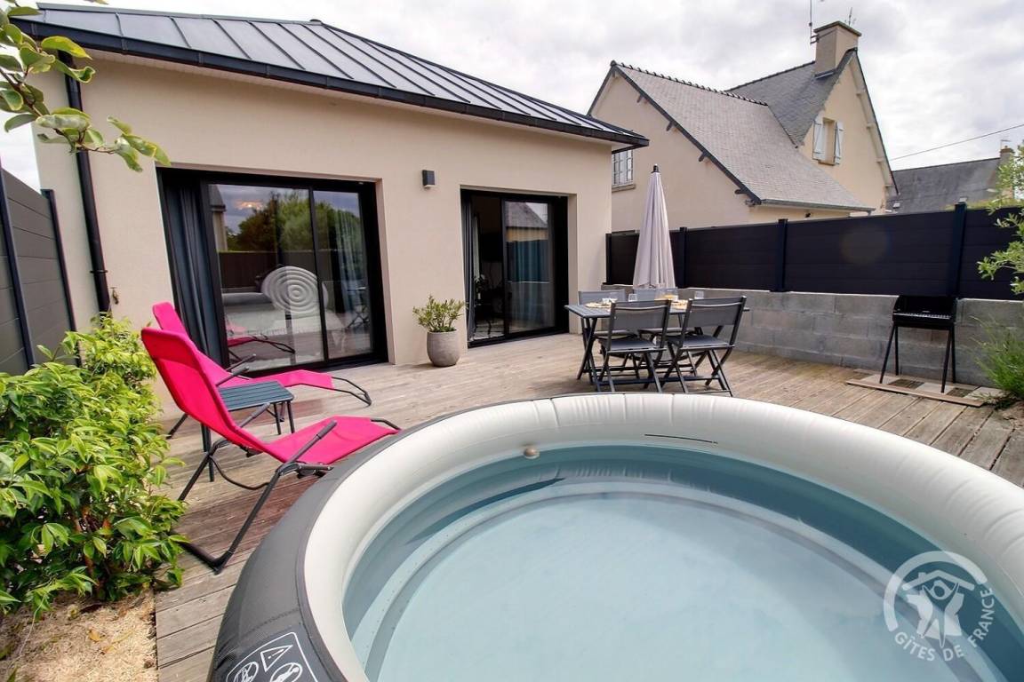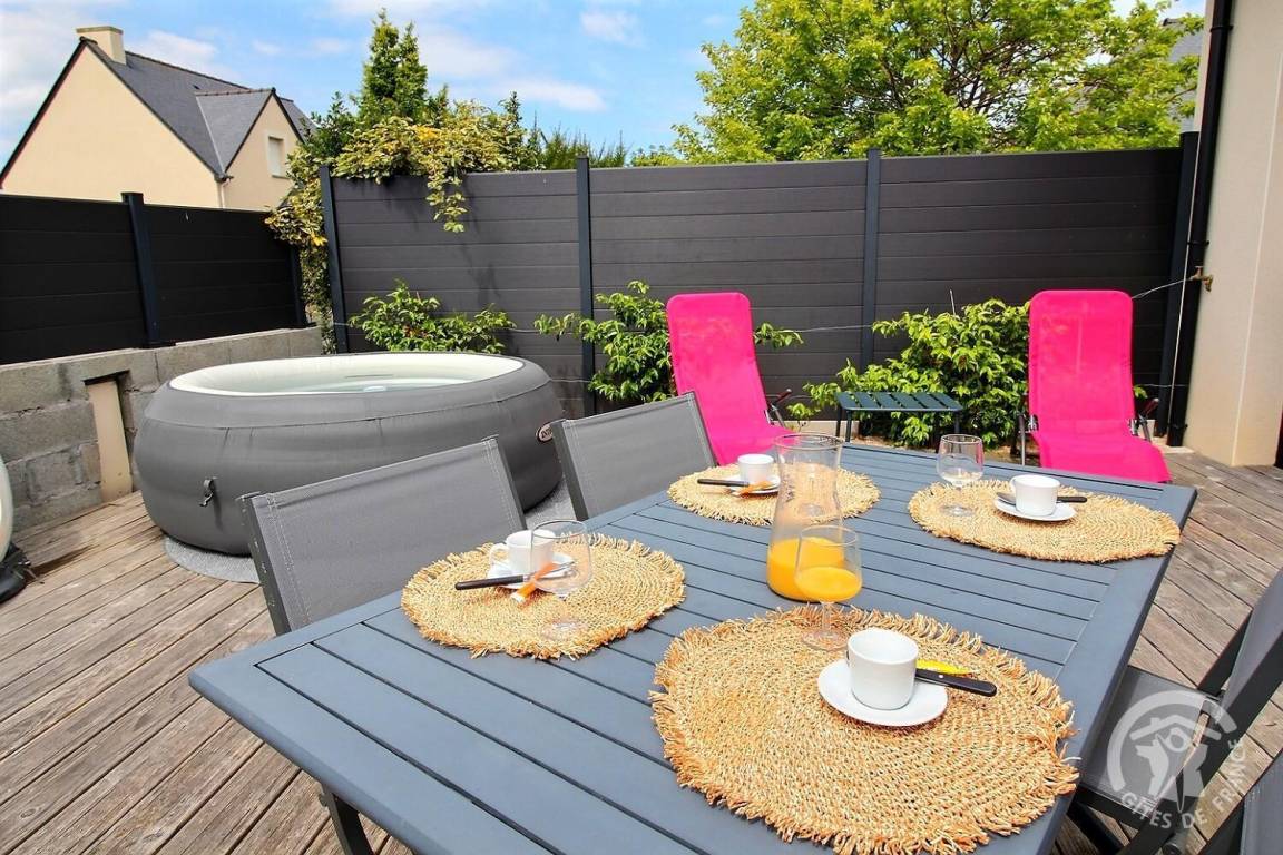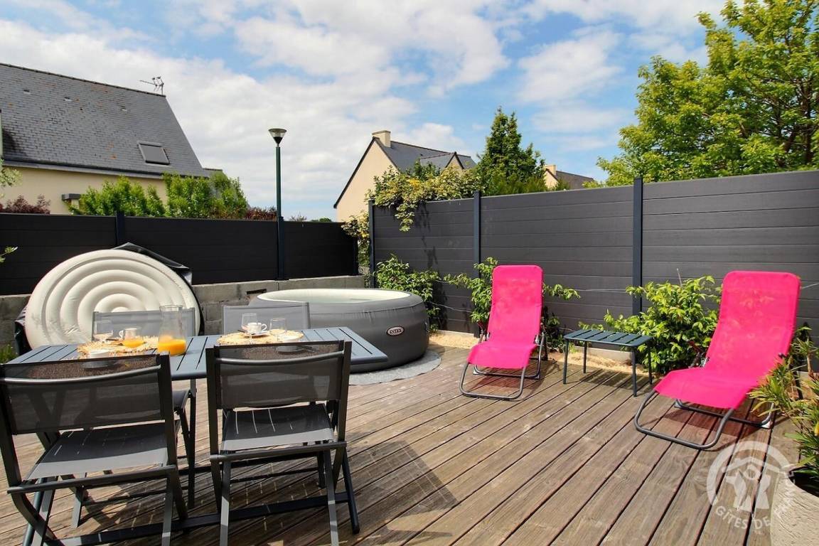 Draußen lädt die Terrasse dazu ein, die sonnigen Tage zu genießen. Dort ist ein aufblasbares Spa installiert.