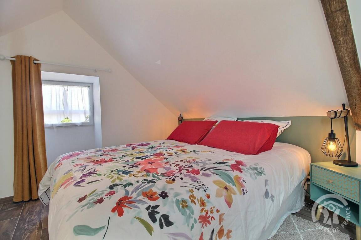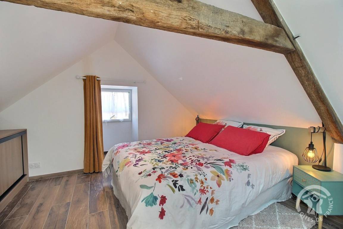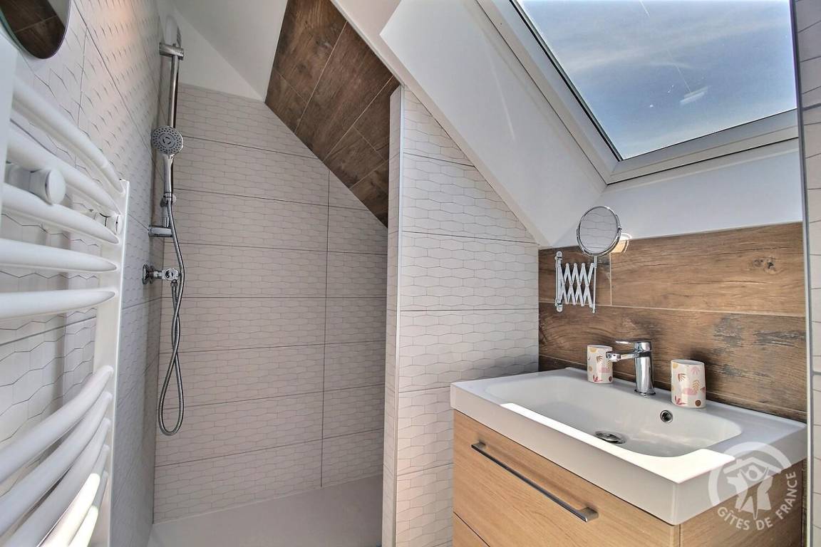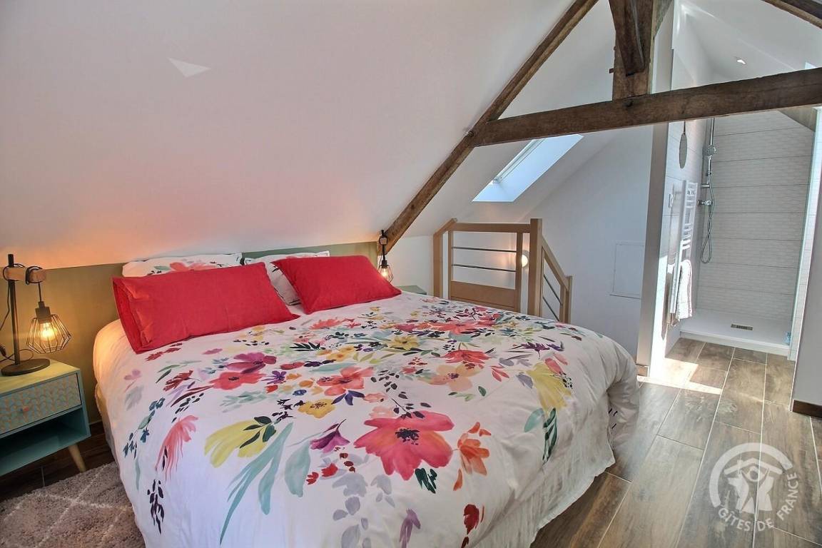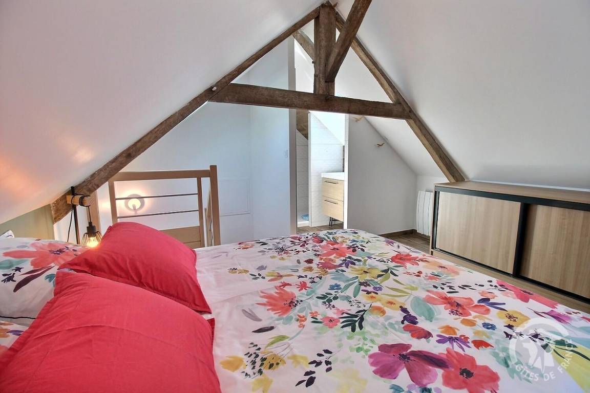 - Obergeschoss: ein Schlafzimmer im Zwischengeschoss, unter Rampen, mit einem 160 x 200 cm großen Bett, das zu einem Badezimmer mit Dusche führt.