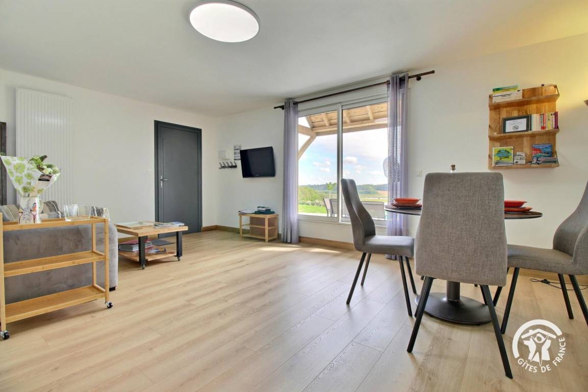 „Le gîte - tout neuf - est confortable, fonctionnel et très propre. L'équipement est complet et la literie excellente. Bonus supplémentaire et non négligeable: La vue panoramique de toute beauté.Accueil chaleureux de la propriétaire et son ami, toujours à l’écoute et aux petits soins pour les vacanciers. Coup de cœur pour les balades à l’infini, pendant des heures, au départ du gîte, dans un environnement calme et bucolique. Sans oublier le charme du village et de son accueillante boulangerie.“