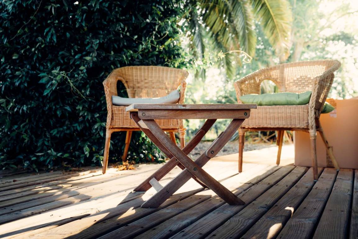 Halbüberdachte Terrasse mit Gartenmöbeln und Grill.