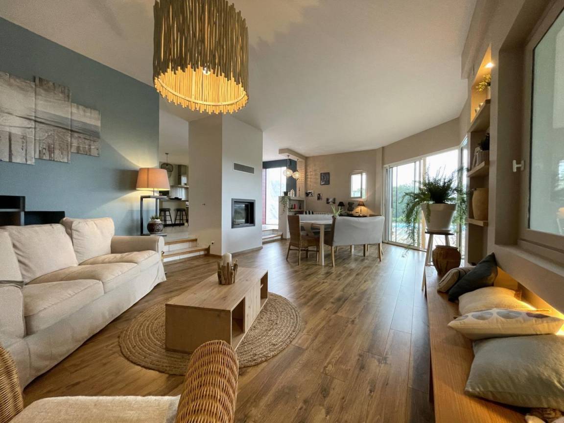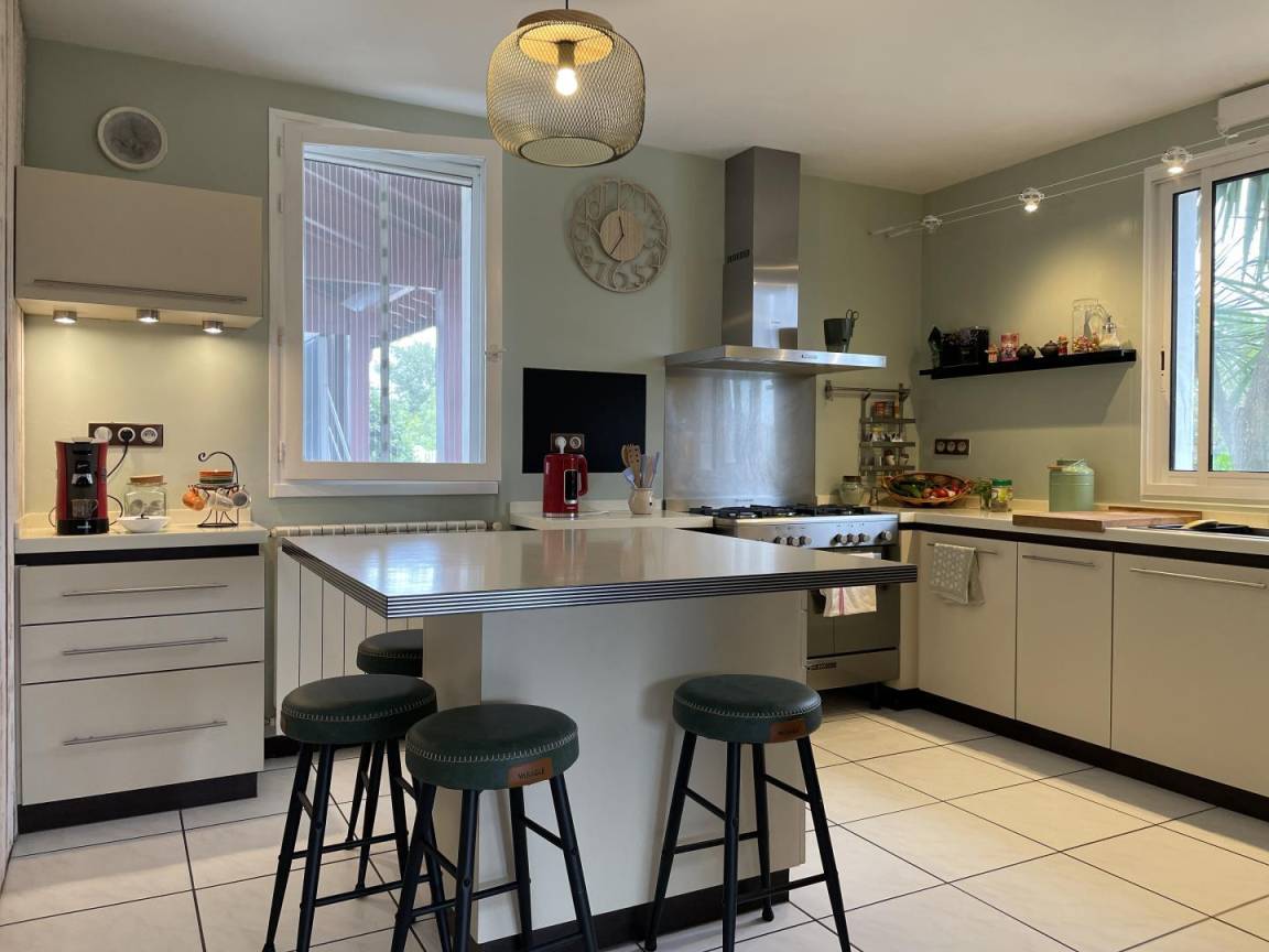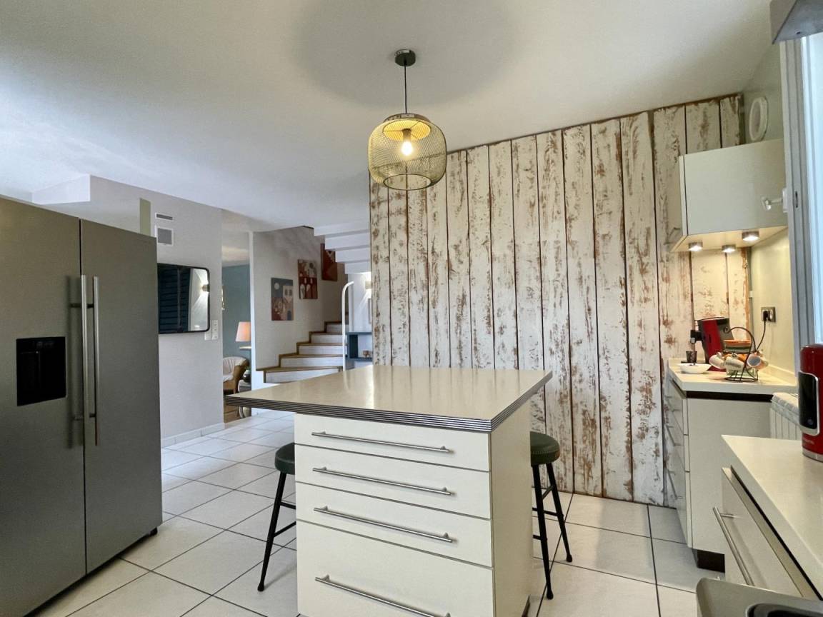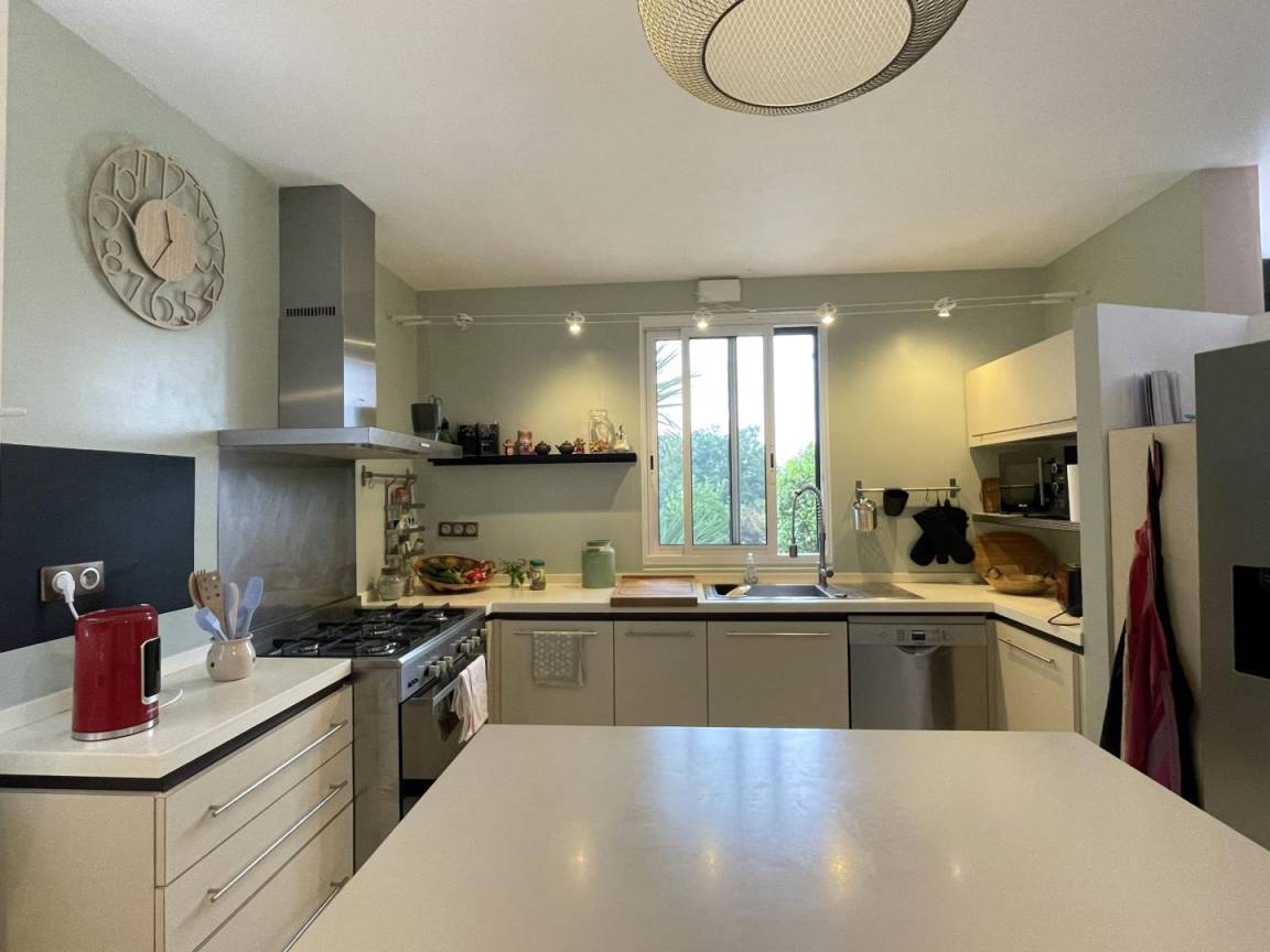 - eine ausgestattete Küche (5-Flammen-Klavier, amerikanischer Kühlschrank, Mikrowelle, Geschirrspüler) und Essbereich