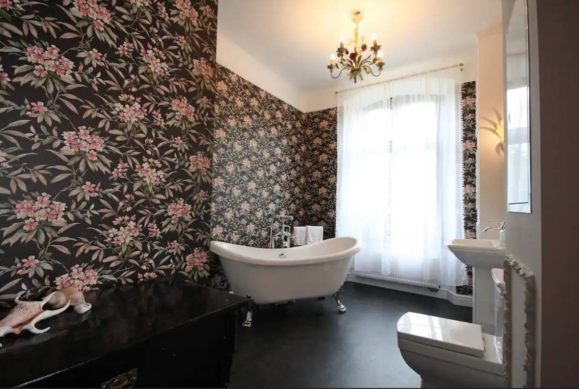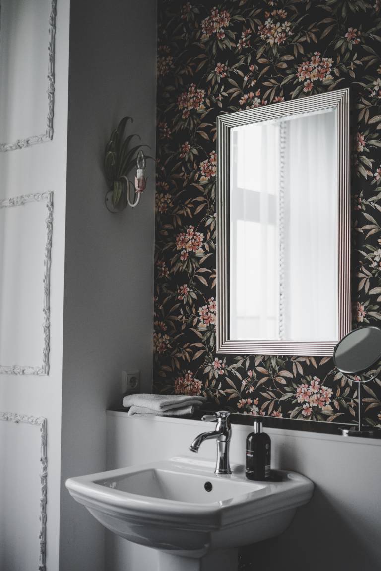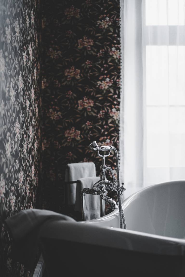Das Highlight der Suite Georg ist das imposante Badezimmer mit der freistehenden Badewanne vor der historischen Tapete. Neben der Badewanne haben unsere Gäste die Möglichkeit sich in der großzügigen Dusche nach einem Ausflug in die wunderschöne Natur Mecklenburgs abzukühlen. Wie wäre es bei einem Glas Champagner und Kerzenschein den Alltag in der Badewanne mit Blick auf den Mond hinter sich zu lassen und sich einfach zu entspannen.
