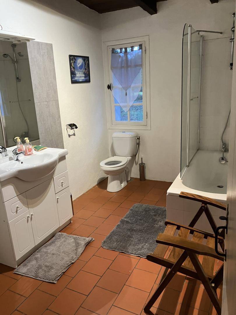 ein Badezimmer mit WC und ein Duschbad mit WC.
