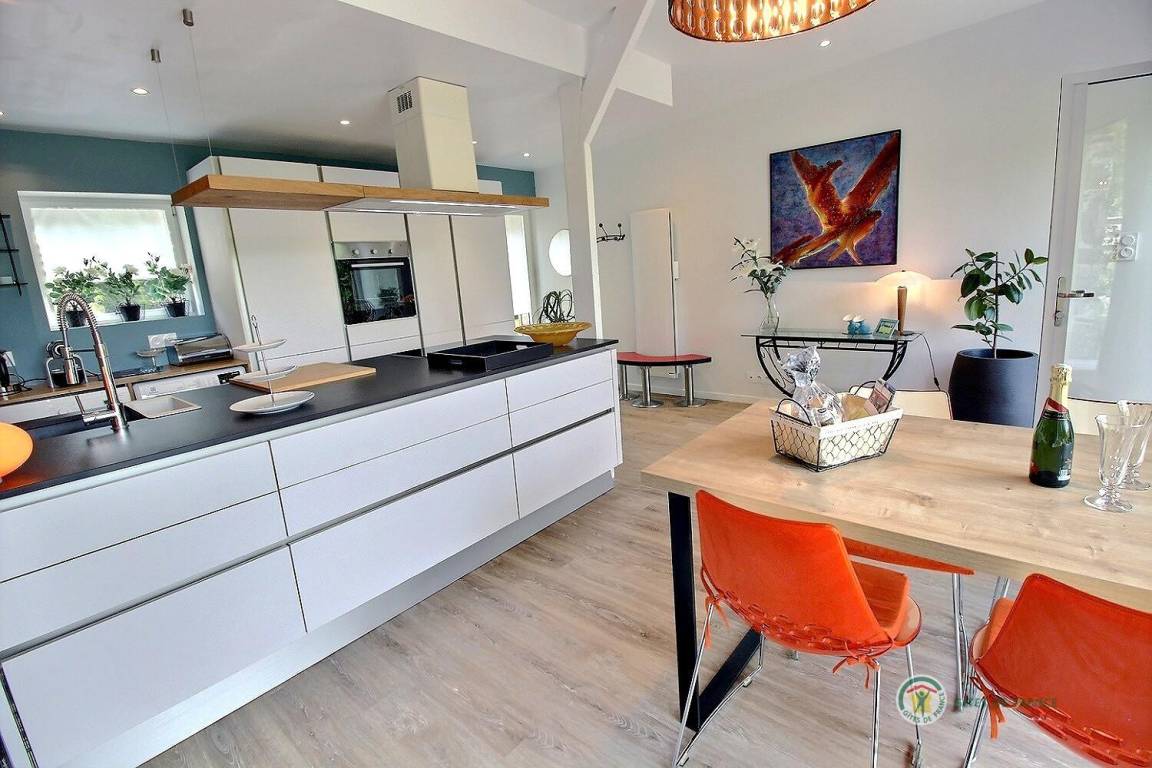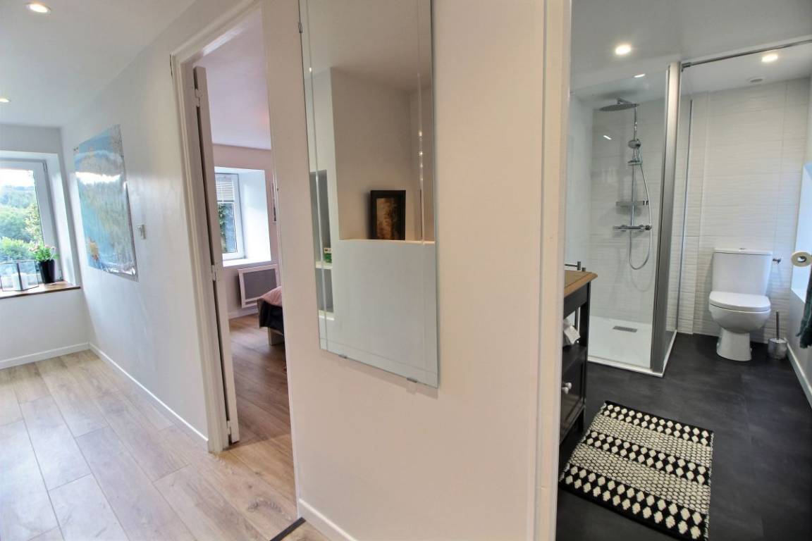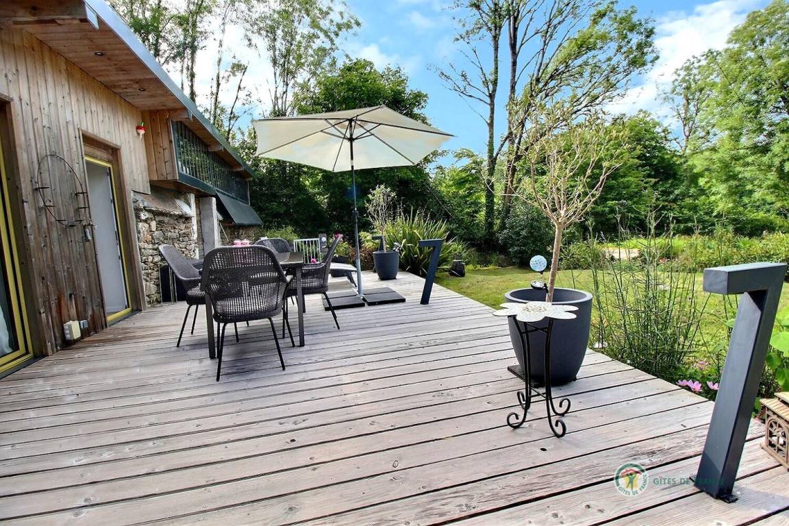 Ihre Ferienwohnung umfasst im Erdgeschoss: Einbauküche-Wohnzimmer, Wohnzimmer, WC mit separatem Waschbecken. Etage 1 (über steile Treppe erreichbar): 1 Schlafzimmer mit 1 Doppelbett 140x200, Badezimmer mit Dusche und WC. Etage 2 (über steile Treppe erreichbar): 1 Mezzanine-Schlafzimmer mit 1 Doppelbett 160x200 mit Waschbecken. Haus, das an ein anderes Ferienhaus grenzt, mit großem Kieshof, großer Holzterrasse von 34 m² (Sonnenliegen) und eigenem, nicht eingezäuntem Garten von 500 m². Möglichkeit eines sicheren Fahrradunterstands.