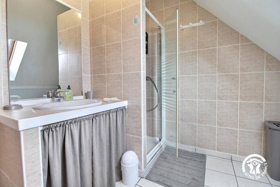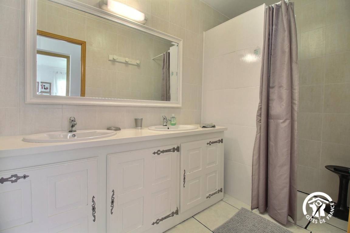 - Im Erdgeschoss öffnet sich die Gîte zum Wohnzimmer mit schönen Öffnungen, einladender Küche, Wohnzimmer und Lounge. Ein Schlafzimmer mit einem 160x200 Bett, ein Duschbad, eine separate Toilette und eine Garage (für 1 Auto), die auch als Waschküche dient.