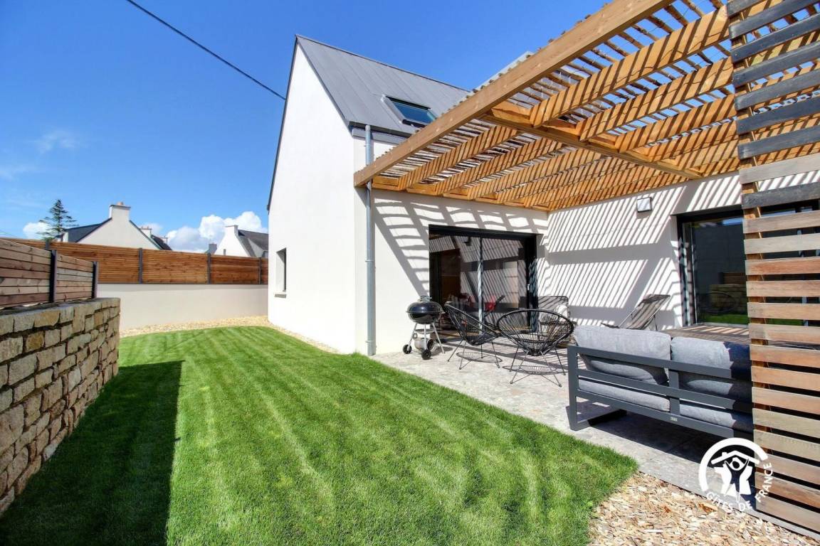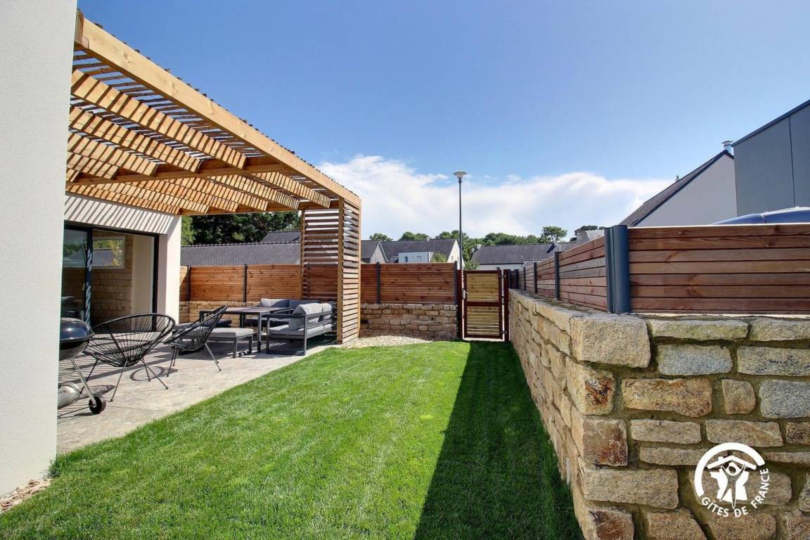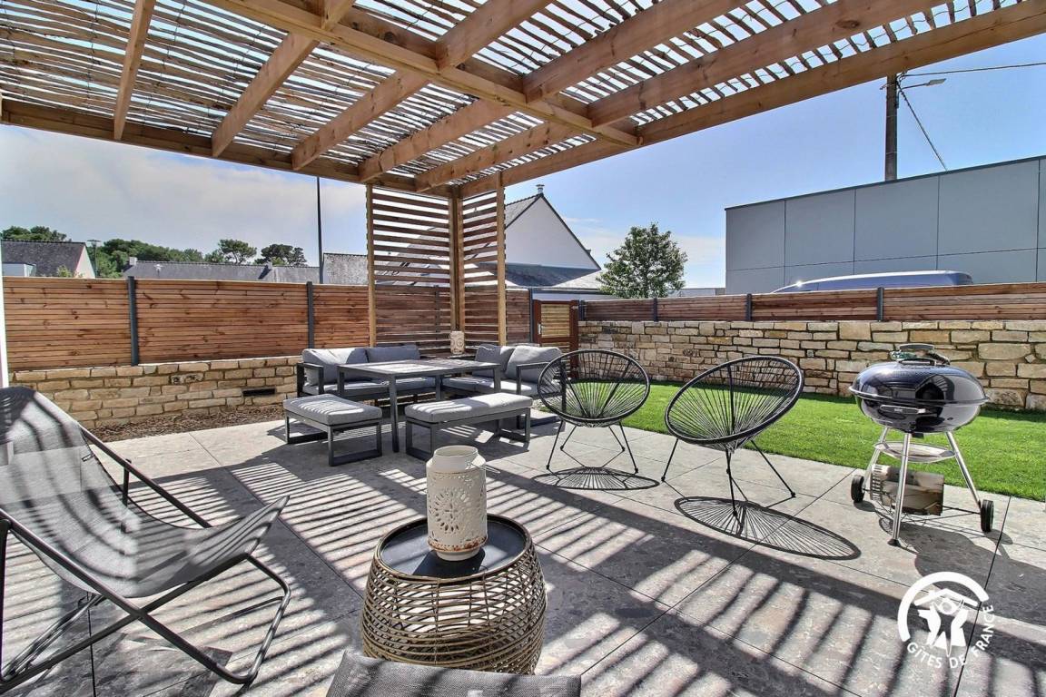 Eingezäunter Garten mit Terrasse, Esstisch, Grill und Liegestühlen.