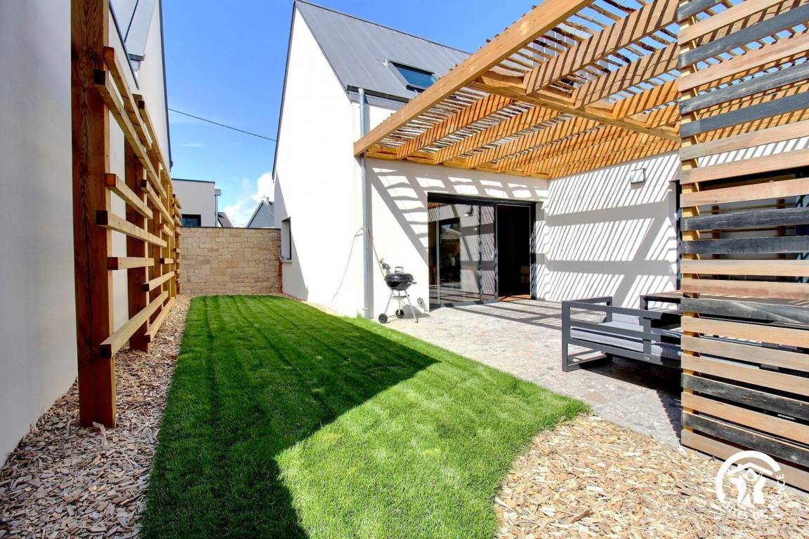 Eingezäunter Garten mit Terrasse, Esstisch, Grill und Liegestühlen.