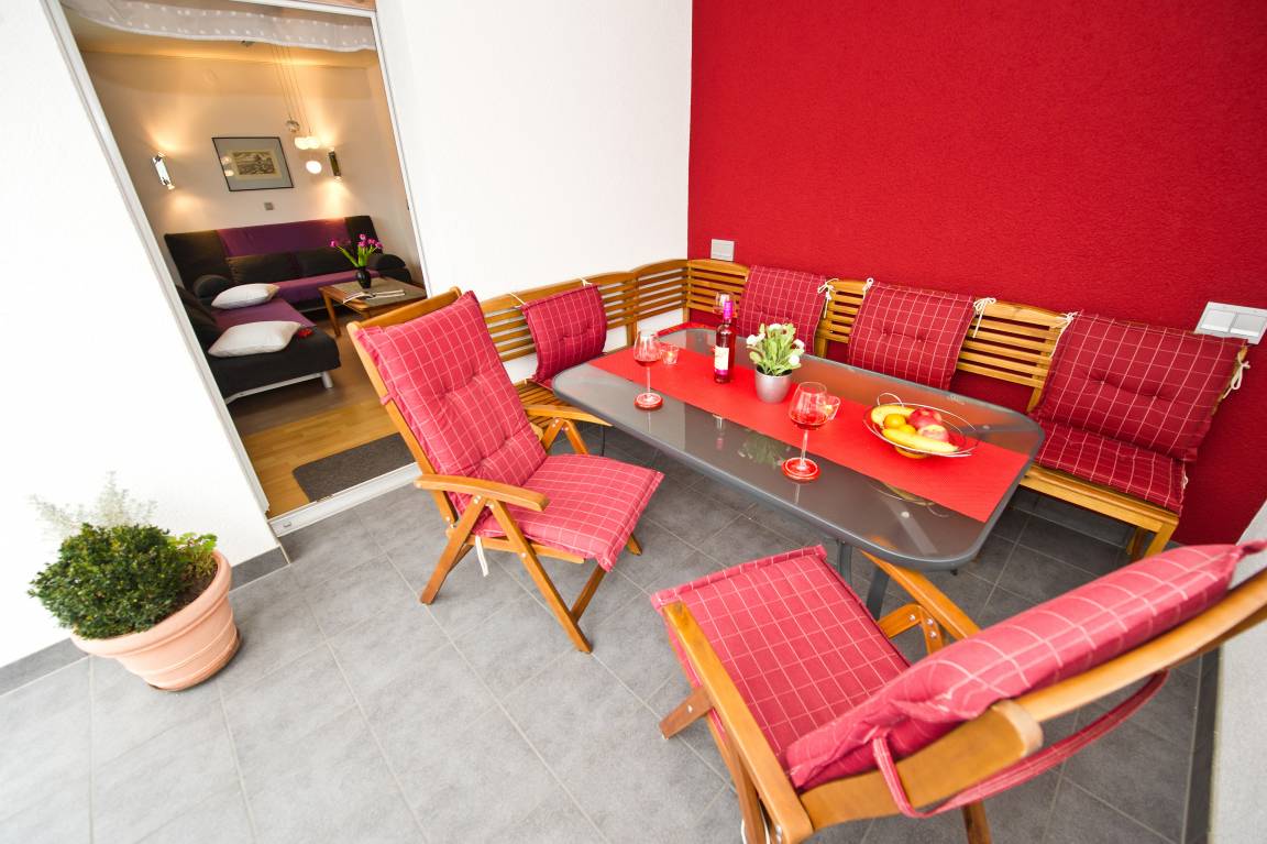 Außenbereich: großer Süd- Balkon mit Loggia, großer Eckbank für Gruppen, Gartenblick
