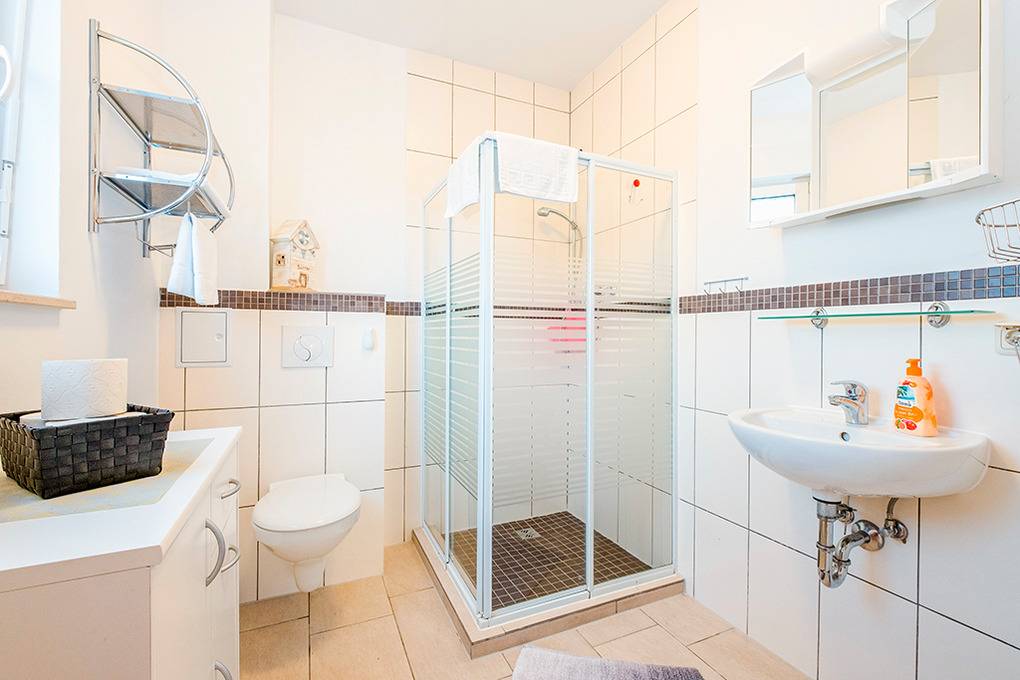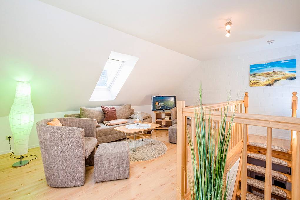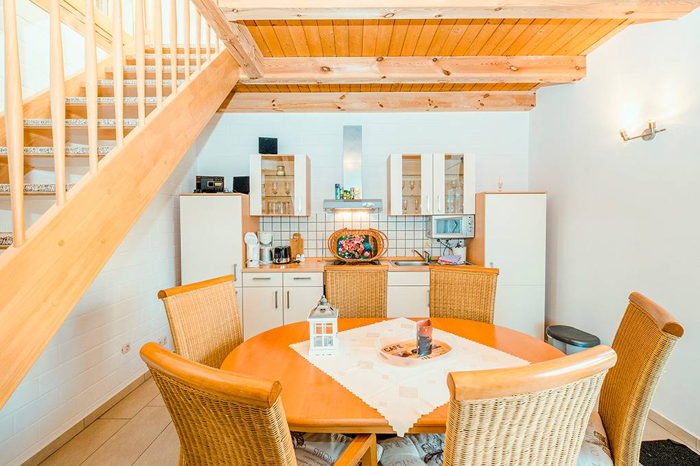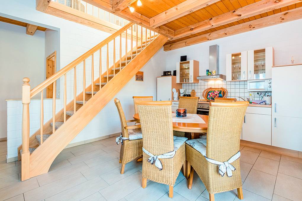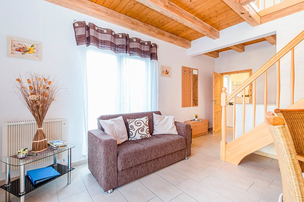 D 15.6 Ferienhaus 2-4 Pers.: 2 1/2-Zimmerhaushälfte, 80 qm Wohnfläche über 2 Etagen. Parterre: Heller Wohn-/Essraum mit Sitzecke, Esstisch, moderner Küchenzeile (Backofen, Mikrowelle). Doppelzimmer. Bad/WC. Treppe in die 1. Etage (leichte Dachschrägen): großzügiger, offener Wohn-/Schlafbereich mit Sitzecke, Sat-TV, 2 Einzelbetten (D 15.6 mit 2 separaten Schlafzimmern). Terrasse mit Sitzmöbeln, Wasserblick (nur bei D 15.6). Grill.