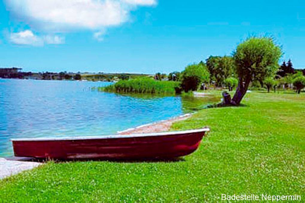 Ort: Neppermin auf Usedom. Idyllisches, kleines Dorf unmittelbar am Achterwasser gelegen. Badestelle mit Liegewiese, Spielplatz 300 m. Beliebtes Fisch-Restaurant, Hof-Café, Boots- und Fahrradverleih je 300 m. Golfplatz Balm 2,2 km. Kaiserbad Bansin mit schönem Ostseestrand ca. 8 km.