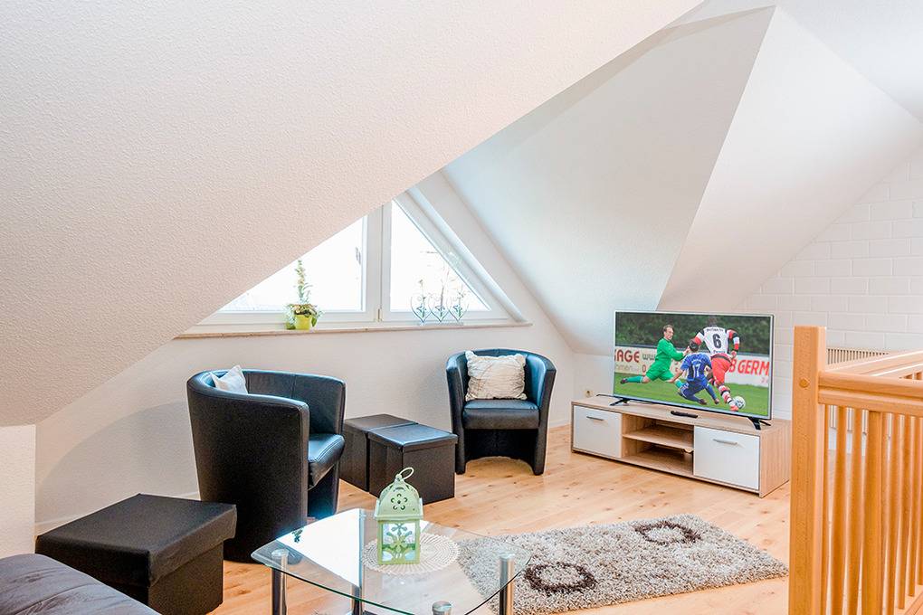 D 15.6 Ferienhaus 2-4 Pers.: 2 1/2-Zimmerhaushälfte, 80 qm Wohnfläche über 2 Etagen. Parterre: Heller Wohn-/Essraum mit Sitzecke, Esstisch, moderner Küchenzeile (Backofen, Mikrowelle). Doppelzimmer. Bad/WC. Treppe in die 1. Etage (leichte Dachschrägen): großzügiger, offener Wohn-/Schlafbereich mit Sitzecke, Sat-TV, 2 Einzelbetten (D 15.6 mit 2 separaten Schlafzimmern). Terrasse mit Sitzmöbeln, Wasserblick (nur bei D 15.6). Grill.