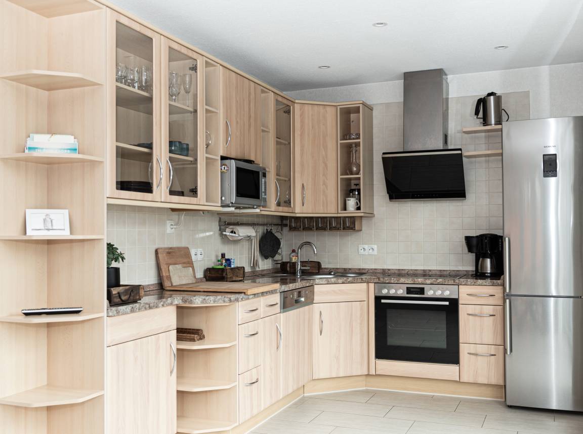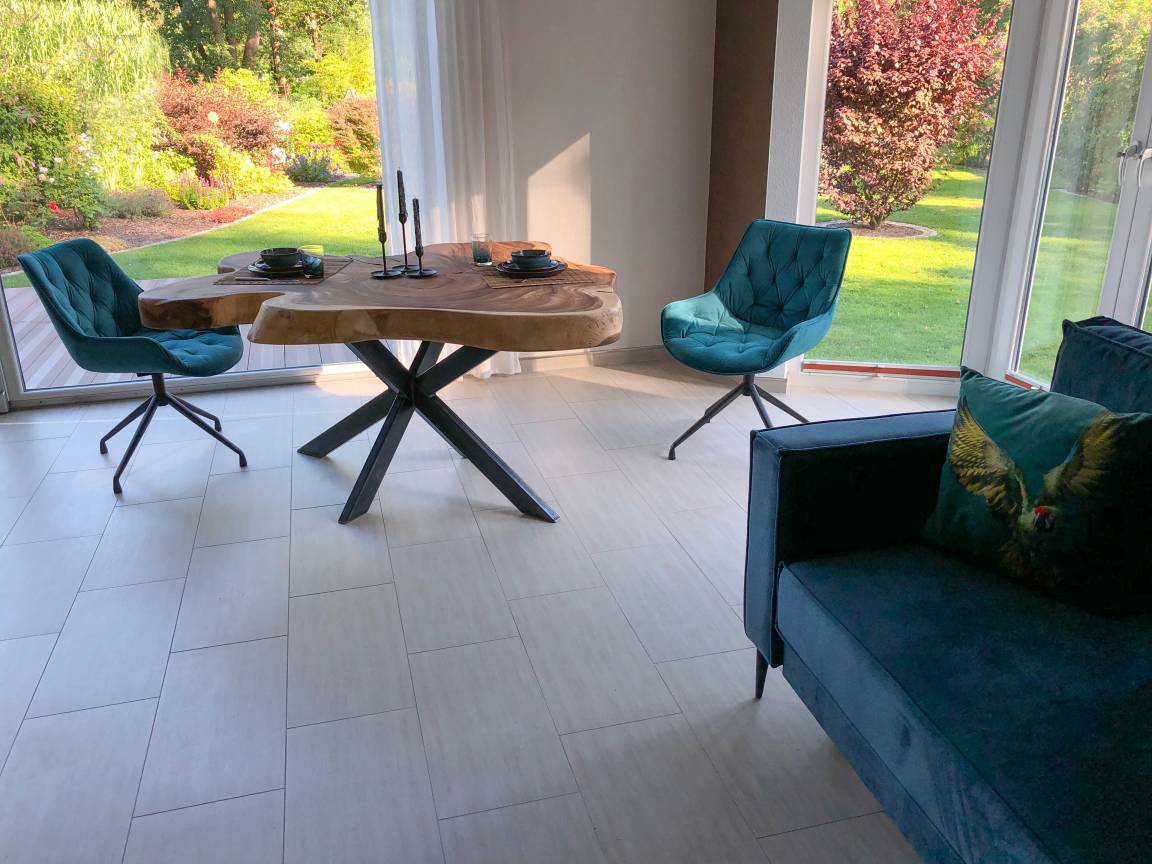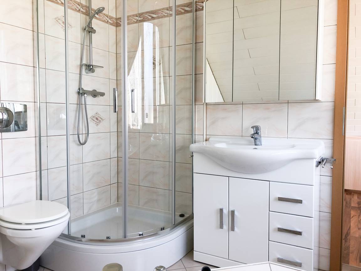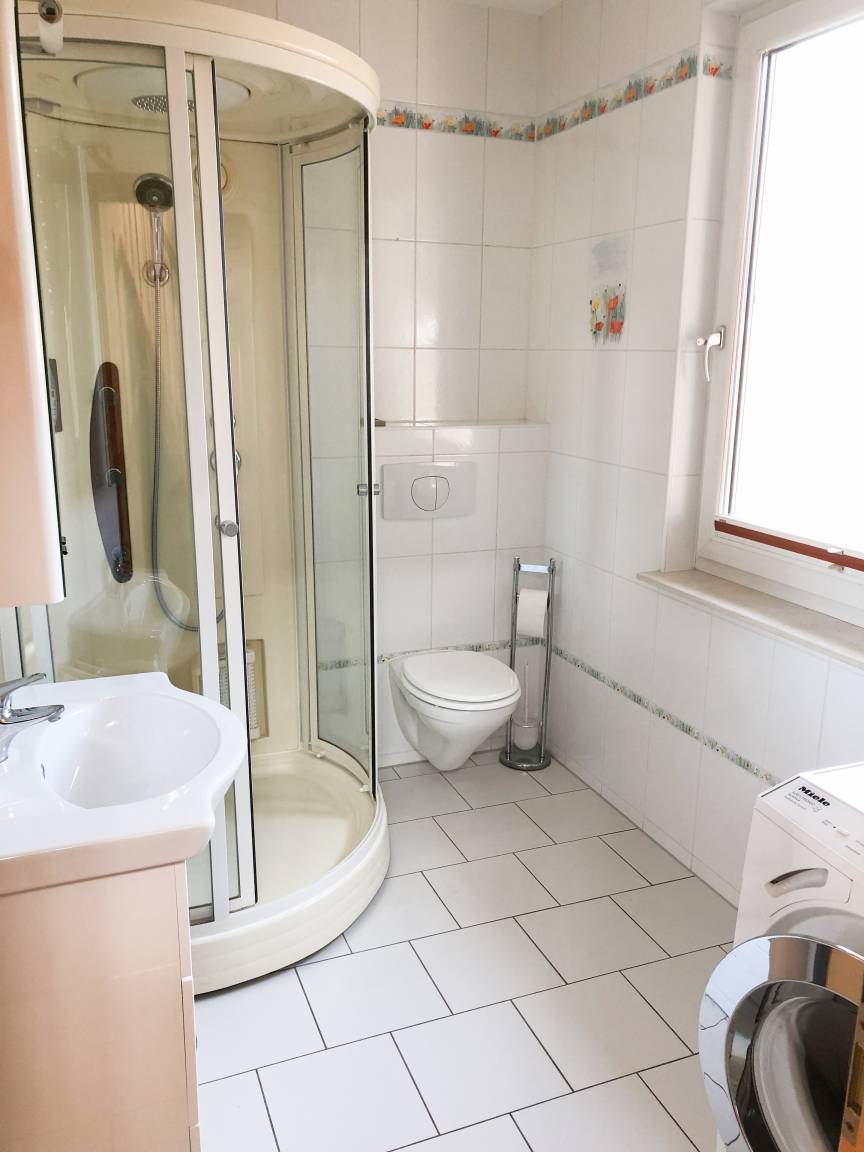 Im Erdgeschoss (mit Fußbodenheizung) ist das Wohnzimmer, die Küche, ein Schlafzimmer, ein Bad mit Dusche/integrierter Dampfsauna und eine Miele Waschmaschine.