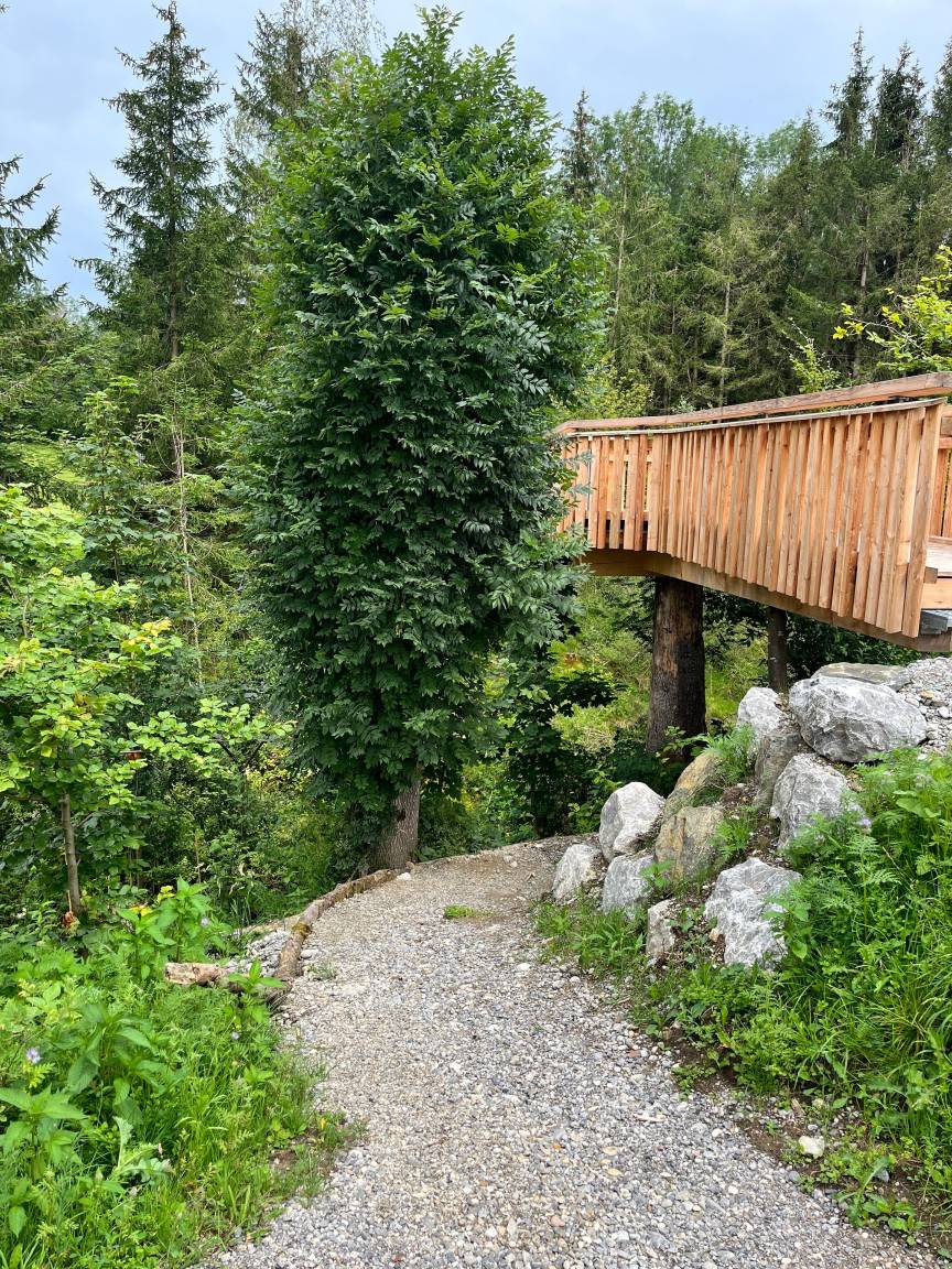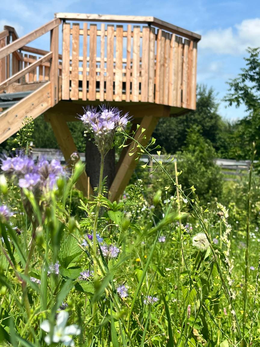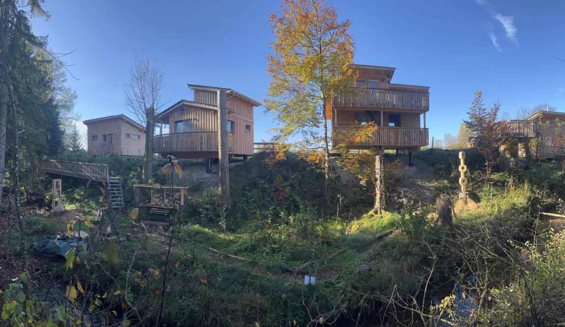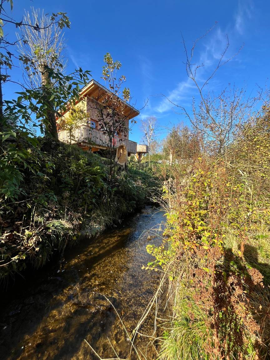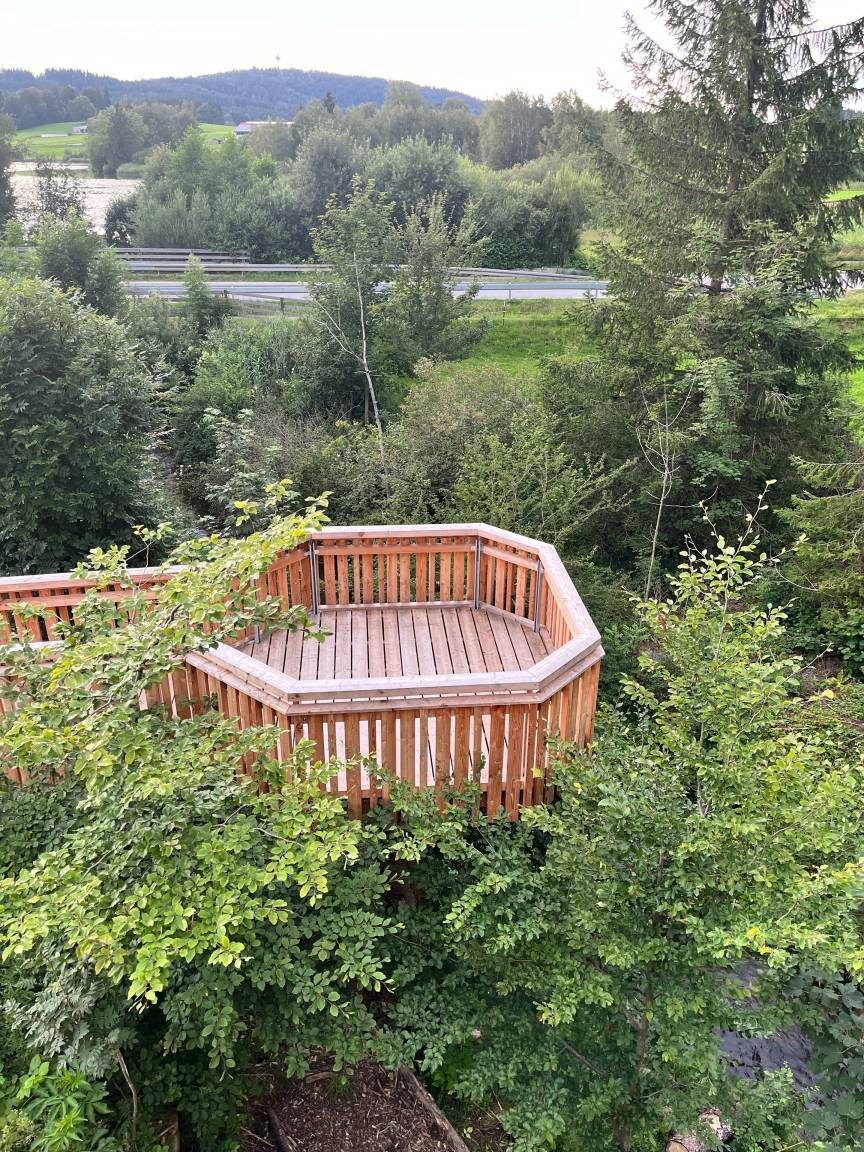 Mensch und Natur begegnen sich auf Augenhöhe. Die Entschleunigung beginnt bei der Anreise. Die letzten ca. 200m geht es vom Parkplatz zu Fuß und mit Leiterwagen zum Baumstelzenhaus. Dort erwarten Dich eine Blüh- und Streuobstwiese, ein neu gepflanzter Wald aus teilweise noch sehr kleinen, heimischen und fremdländischen Gehölzen, ein Bach mit Steg, zwei Baumkanzeln und mittendrin drei Baumstelzenhäuser. Über die Straße befindet sich der Haslacher (Bade)See am Auerberg (1055m).