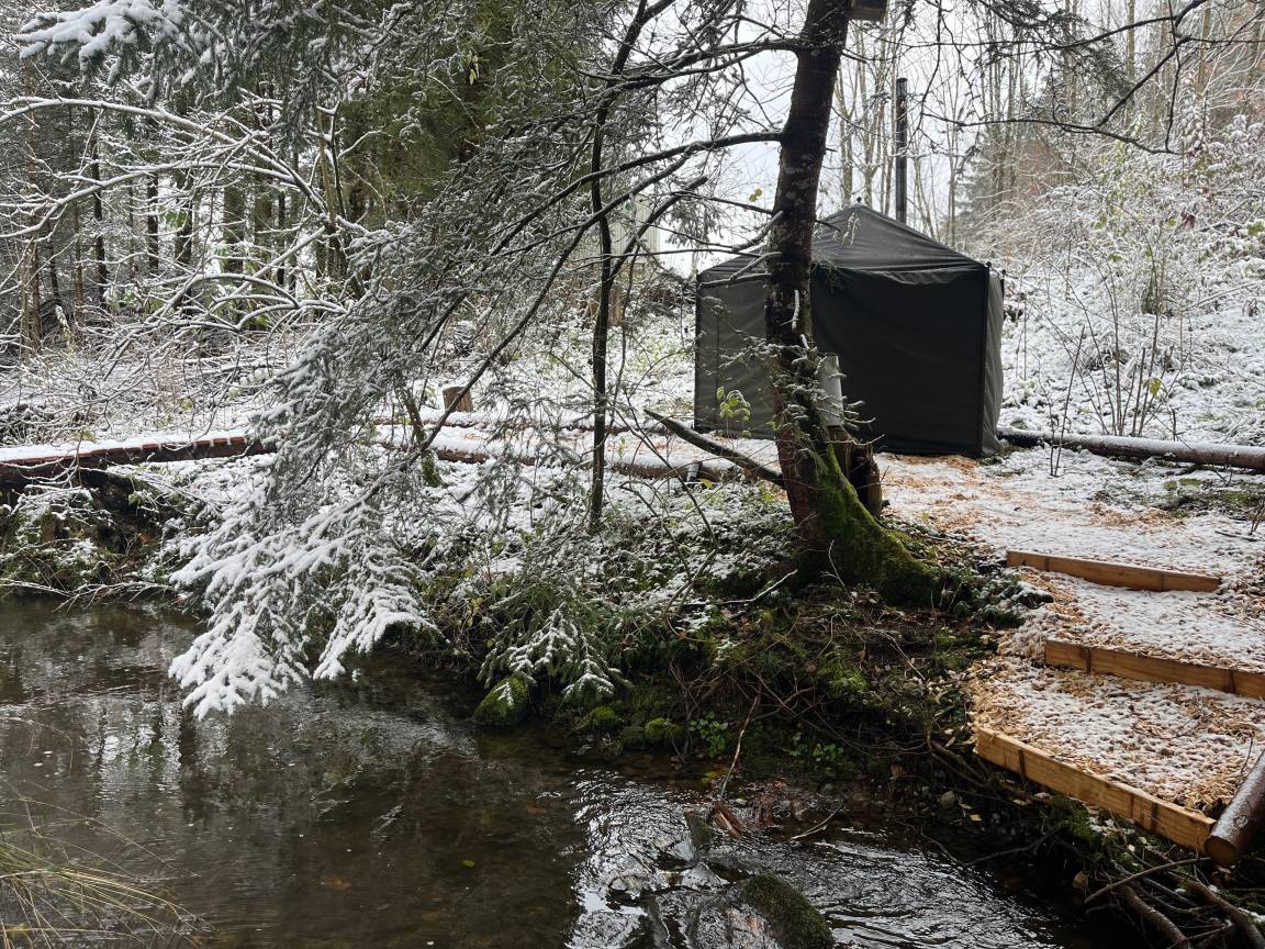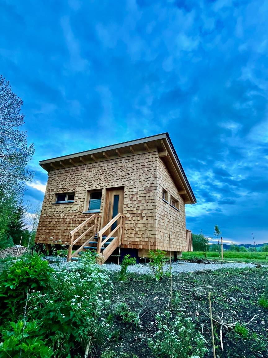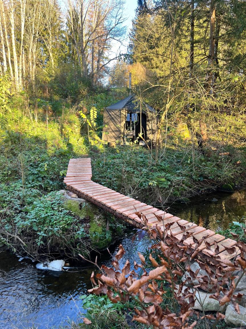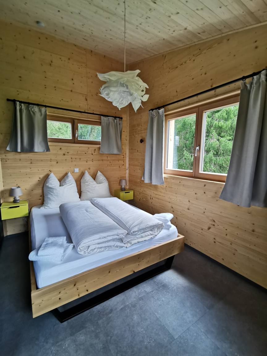 Das Baumstelzenhaus ist 2024 in nachhaltiger Holzständerbauweise gebaut, energetisch gedämmt, mit Fußbodenheizung und Solarstrom ganzjährig bewohnbar. Auf 25 qm fehlt es an nichts und beantwortet die Frage: Wieviel Platz braucht man eigentlich zum Leben. Voll ausgestattete Tinyküche, 1 Schlafzimmer mit Doppelbett und optionalem Kinderreisebett, Bad mit Dusche und WC, ein großer Südbalkon mit Bergblick. Kleine Besonderheit: Eine estländische Zeltsauna versteckt sich im Wald direkt am Bach. Mit Holzofen. Rustikal.