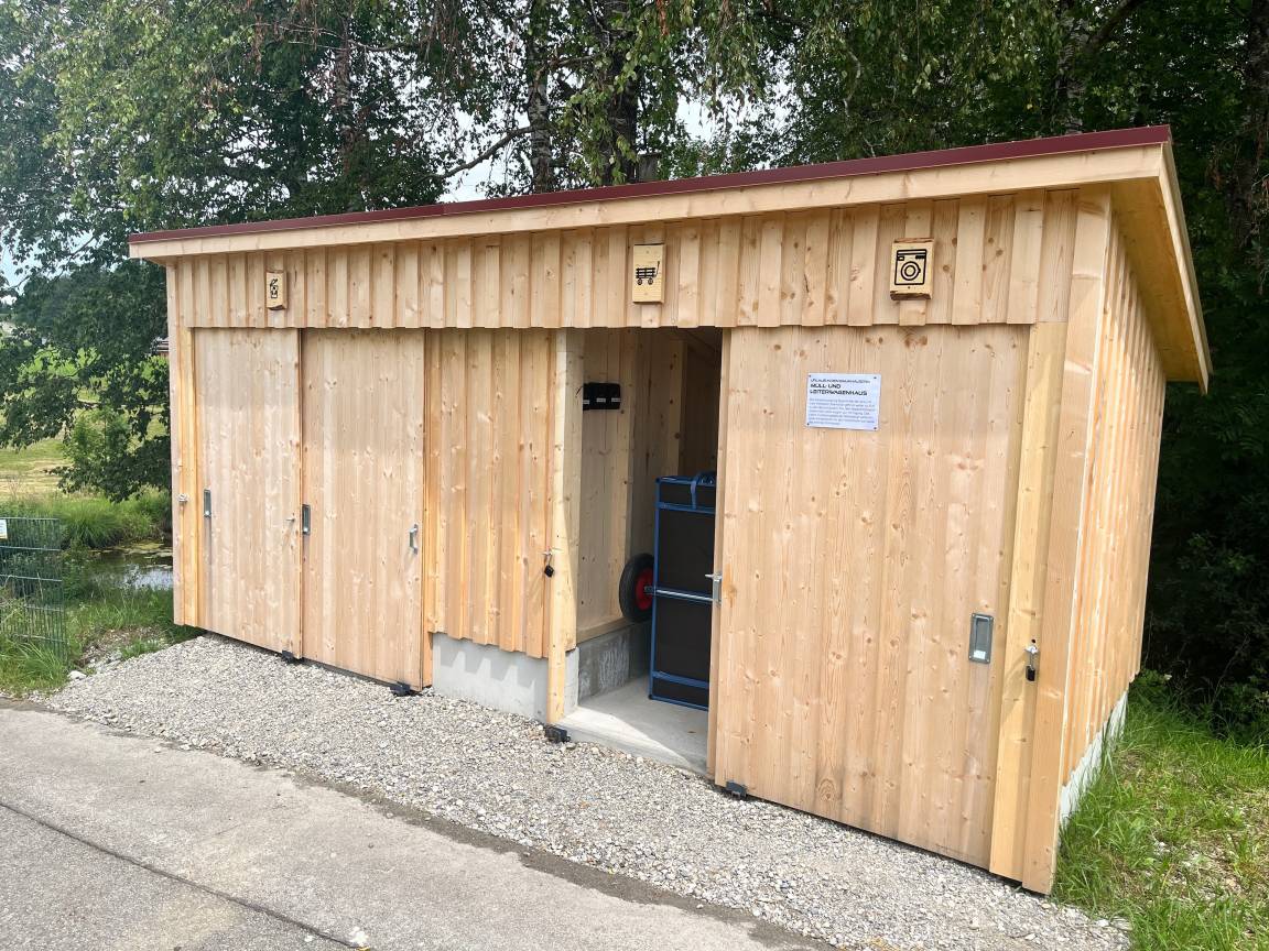 Unmittelbar angrenzend befindet sich ein kleiner Holzschuppen. Dieser beherbergt pro Haus einen Leiterwagen für den Gepäcktransport zum Baumhaus sowie den Haustransponder in einem Schlüsseltresor (siehe Anfahrtsskizze unter Fotos). Der Zahlenschloss-Code wird einige Tage vor Anreise zugesandt. Fahrradabstellplätze befinden sich direkt am Baumhaus.