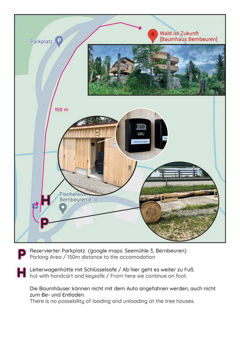 Das Gelände und die drei Baumstelzenhäuser sind nicht direkt mit dem Auto zu erreichen, was dem Projektziel entspricht, keine Flächen zu versiegeln. Ein Parkplatz steht in ca. 200m Entfernung an der Seemühle zur Verfügung.