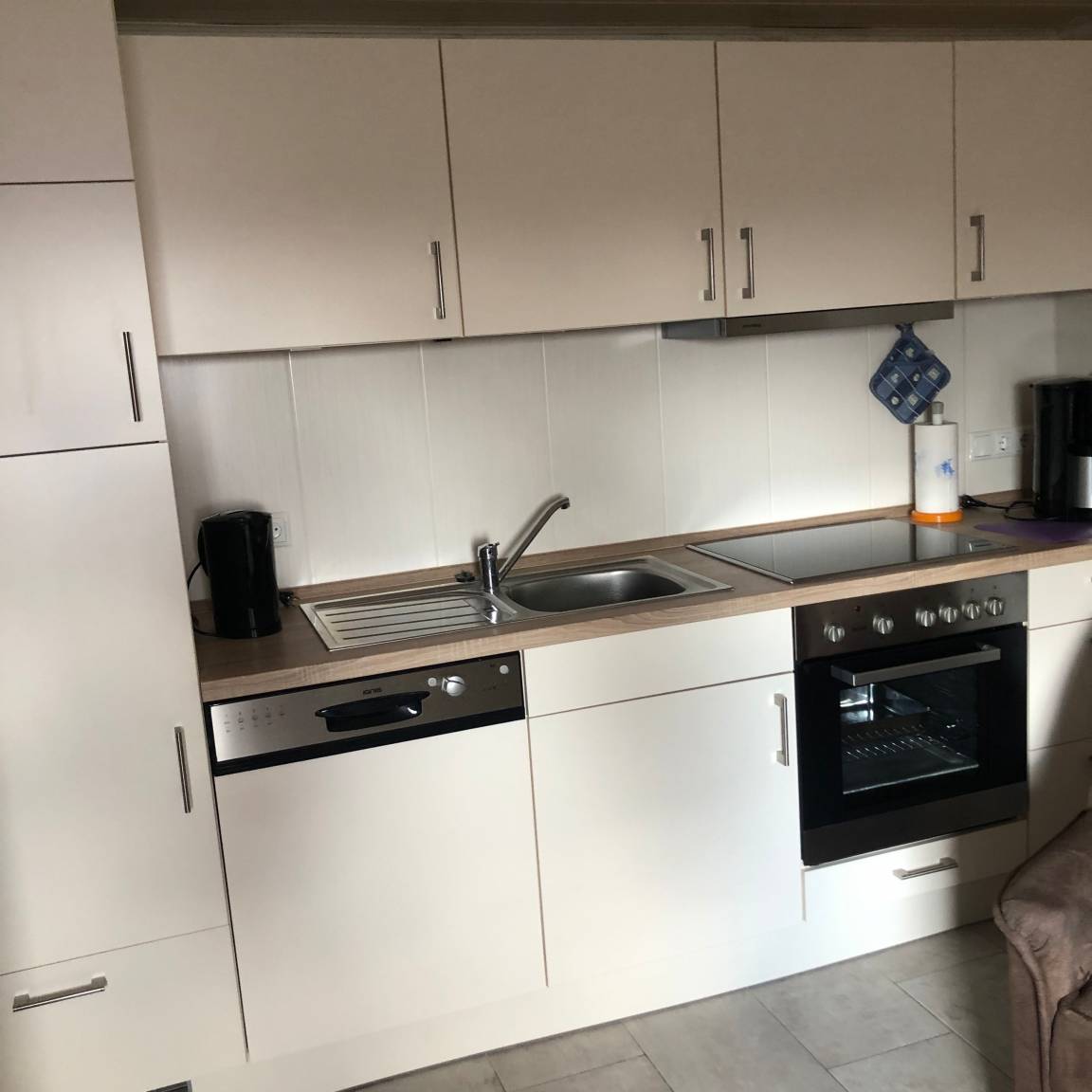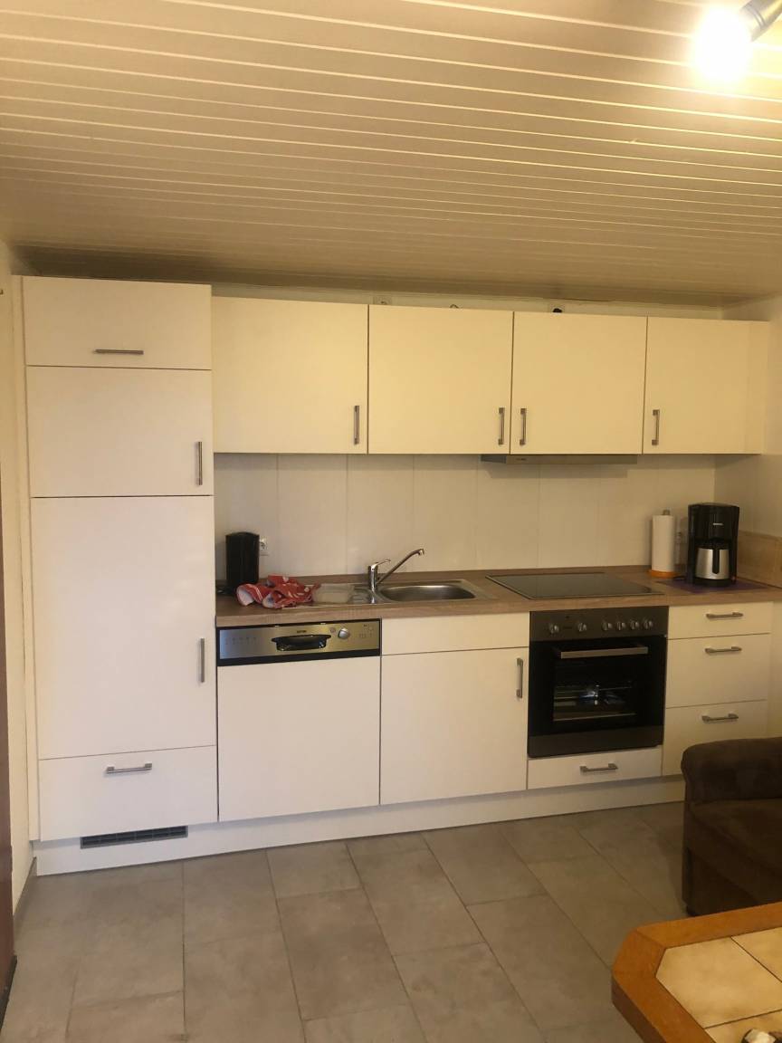 Im Erdgeschoß ist eine gut ausgestattete Wohnküche mit Spülmaschine und kleinem Gefrierschrank. Ein Fernseher sowie