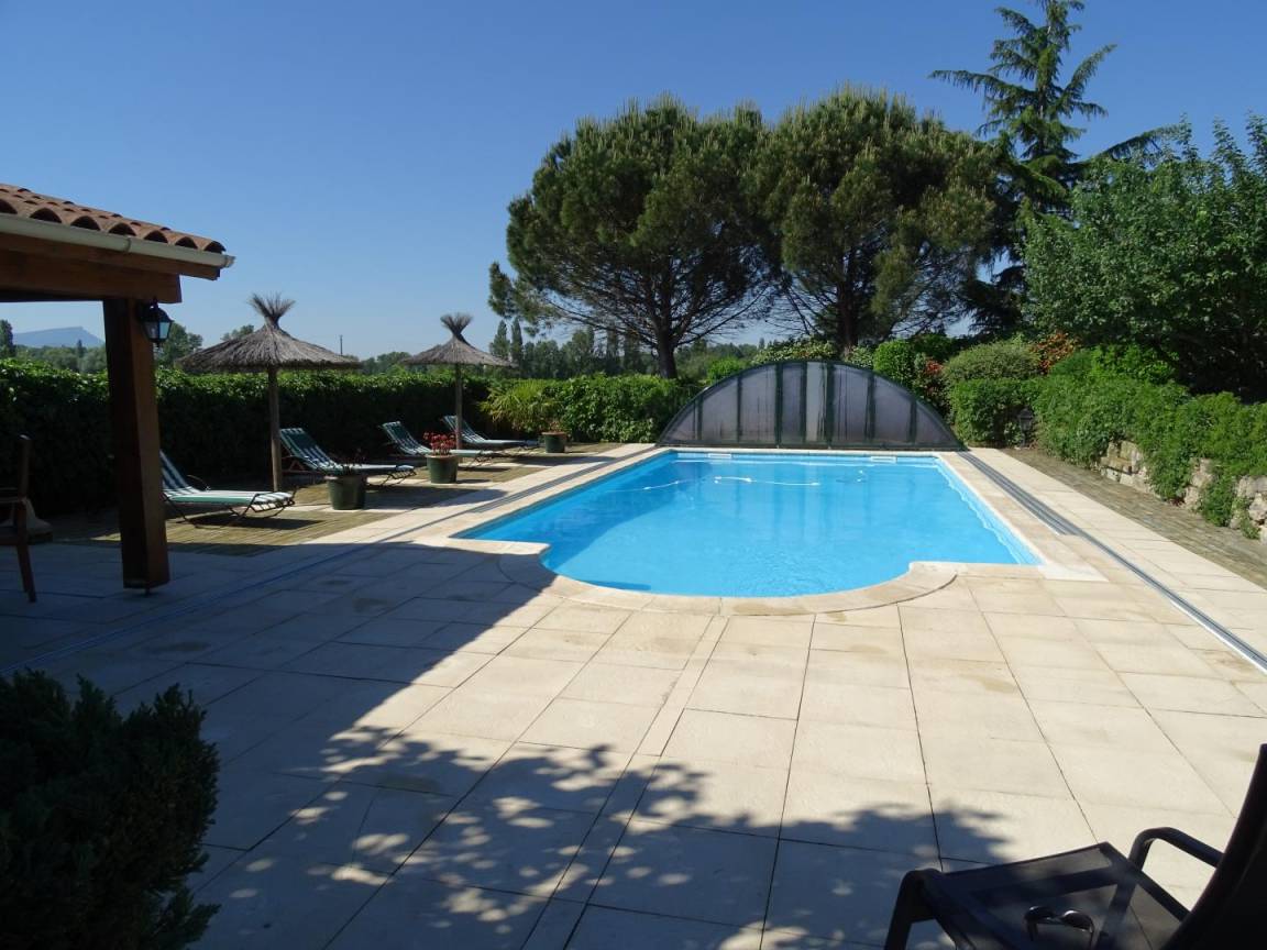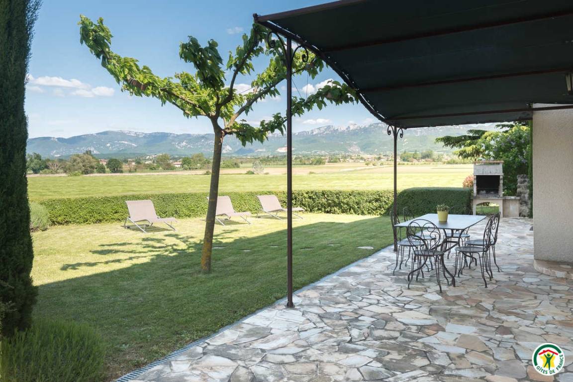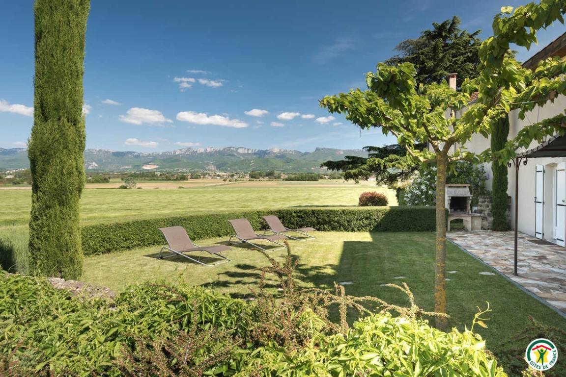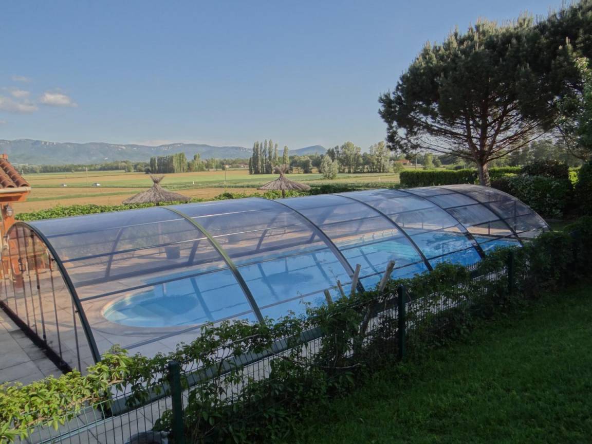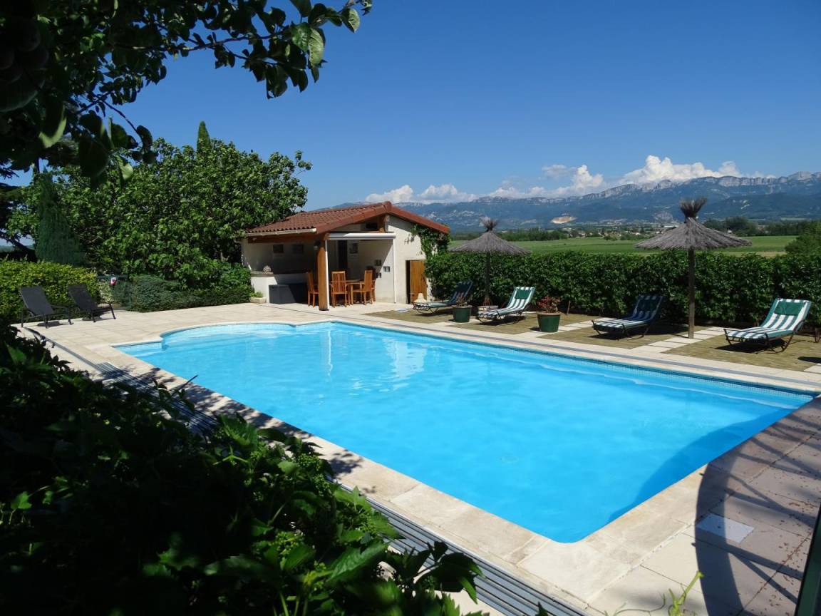 „A very nice, quiet and spaceful setting with a wide view on the Vercors and a nice swimming pool.“