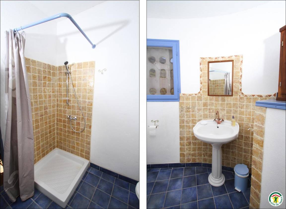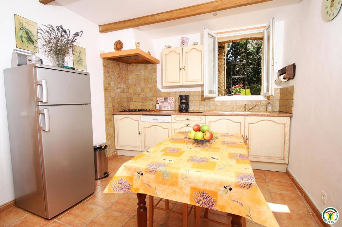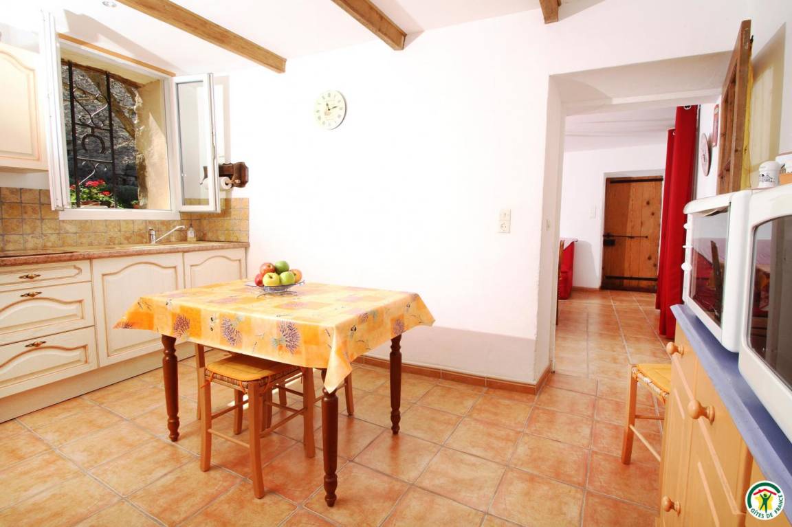Erdgeschoss: Küche, Wohn-/Esszimmer (1 Schlafsofa 140 cm), WC. Obergeschoss: 2 Schlafzimmer mit Verbindungstür (2 Betten 90 cm) (1 Bett 140 cm), Bad mit Dusche/WC. Umschlossener, schattiger Hof, überdachte Terrasse und kleiner Aussichtspunkt unter den Linden mit Picknick-Bereich. Garage für Motorräder.