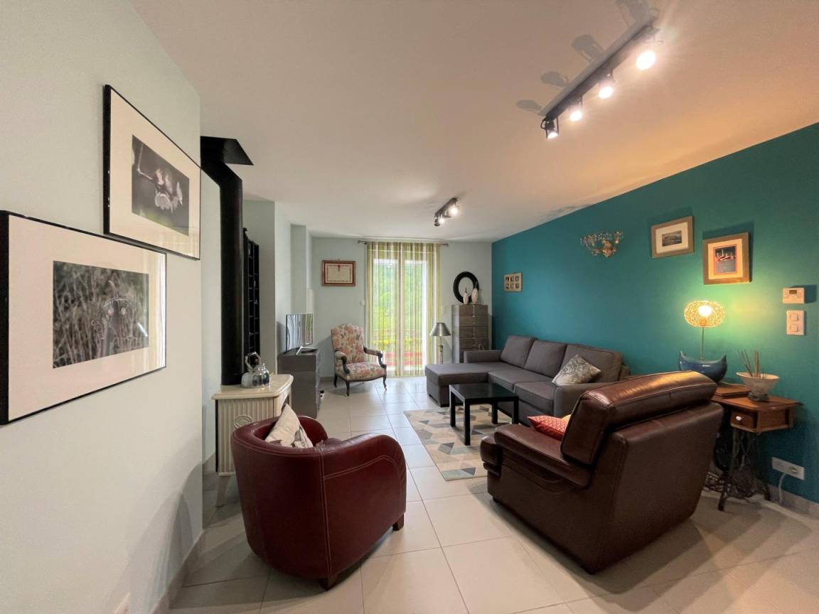 Gemütliches Wohnzimmer mit Flachbildfernseher, Internet (Glasfaser) und Telefon sowie Arbeitsbereich.