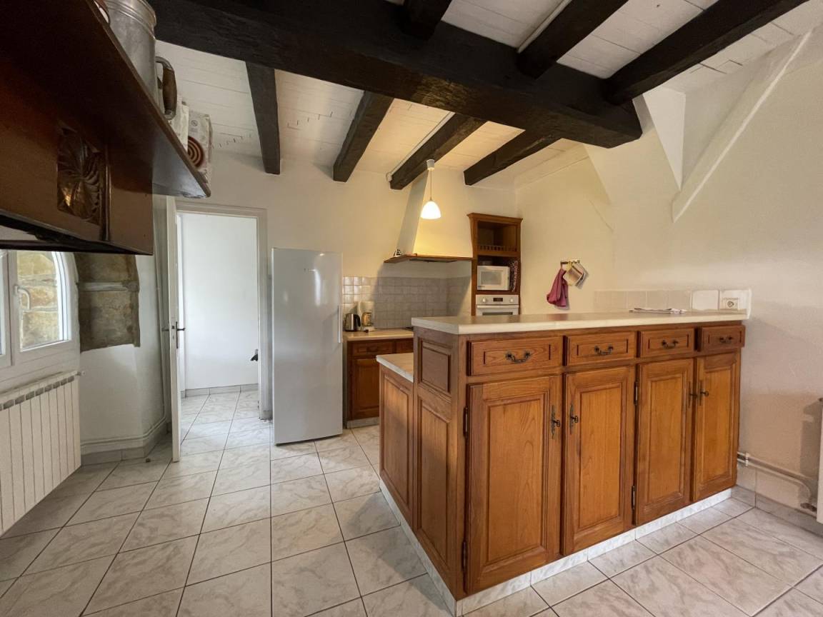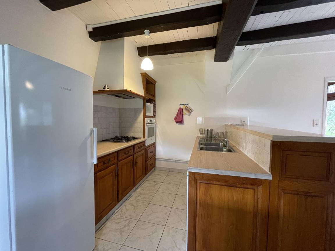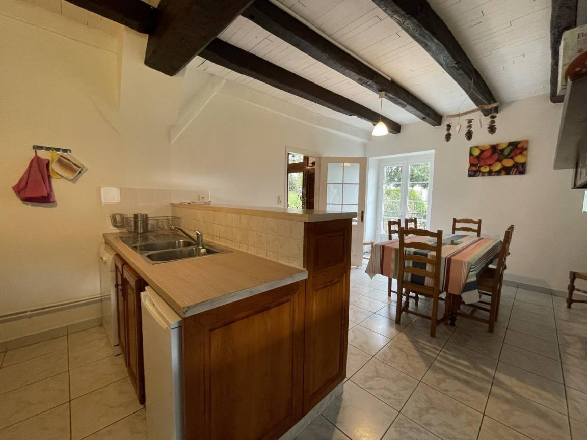 Erhöhtes Erdgeschoss. Ausgestattete Küche mit Zugang zur Terrasse (Senséo-Kaffeemaschine, großer Kühl- und Gefrierschrank, Mikrowelle, Backofen, 3-Flammen-1-Elektroherd, Geschirrspüler), Essbereich.