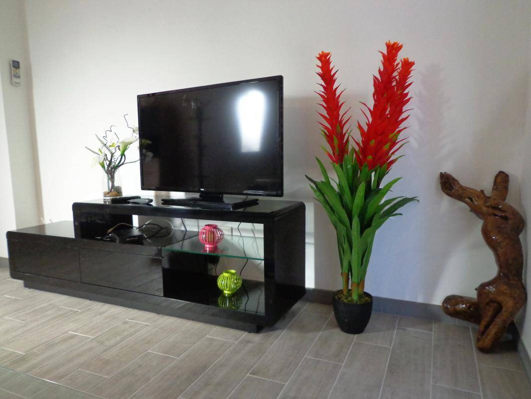 ein Wohnzimmer mit voll ausgestatteter Küche (Backofen, Mikrowelle, Geschirrspüler), das in einen Wohnbereich mit TV-Ecke übergeht,