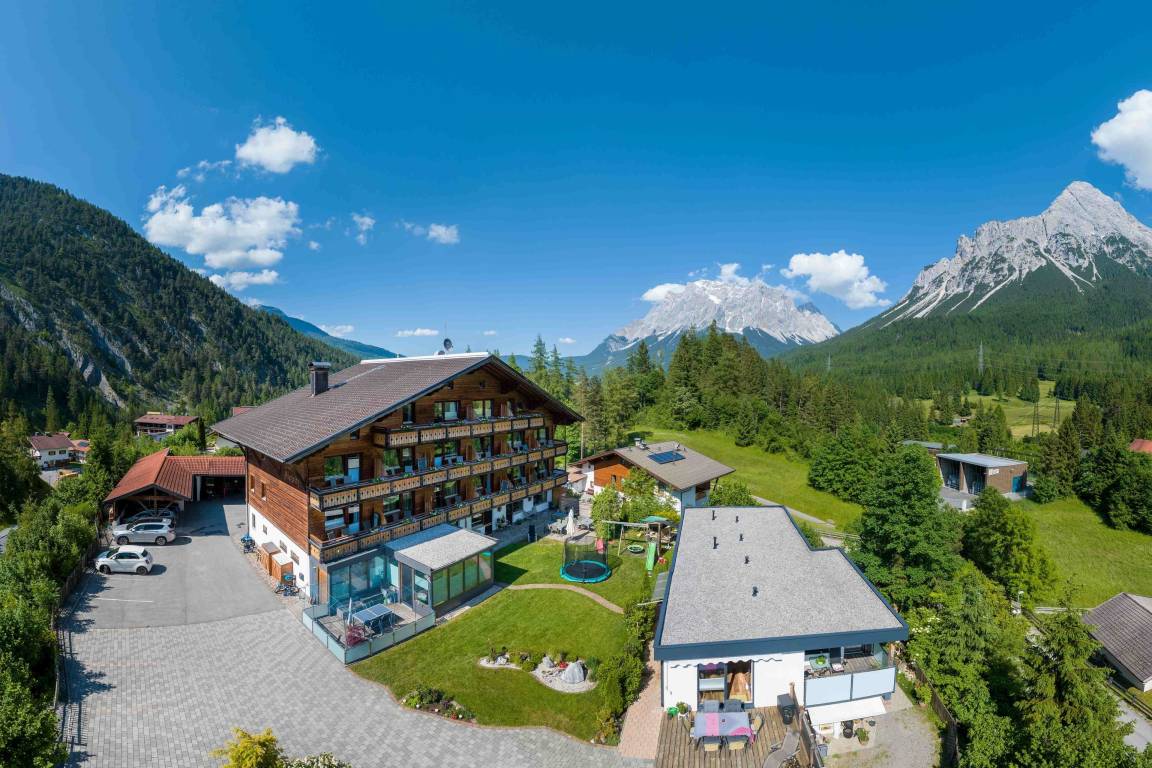 Unsere Familienpension bietet Ihnen gemütliche Apartments und Doppelzimmer mit Frühstück, einen modernen Wellnessbereich sowie grandiosen Ausblick auf die Zugspitze und unsere Bergwelt.