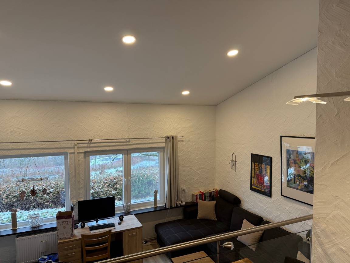 Das Wohn-/Esszimmer ist mit einem neuen Kaminofen und einem großen Flat-TV ausgestattet, die zweckmäßig eingerichtete, neue Einbauküche mit Cerankochfeld verfügt über Spülmaschine, ein dekoratives Bad mit ebenerdiger Dusche und Sitz, ein Schlafzimmer mit Bockspringbett und TV und ein Schlafzimmer mit 2 Einzelbetten ergänzen die Einrichtung des Hauses. Internet via Sky-DSL mit 16 MB und ein Internetradio sind vorhanden.